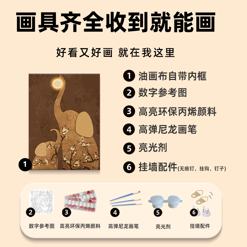 中古风吉象如意数字油画diy填充色手工绘大象丙烯油彩装饰画挂画