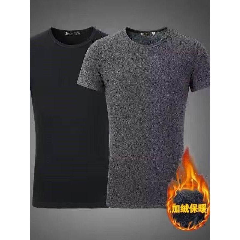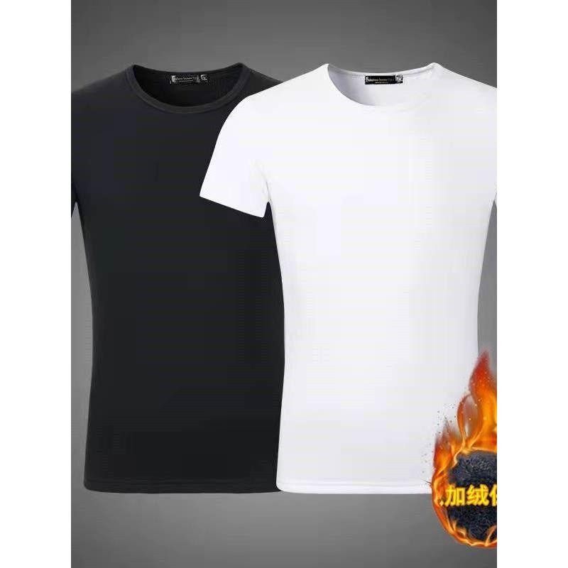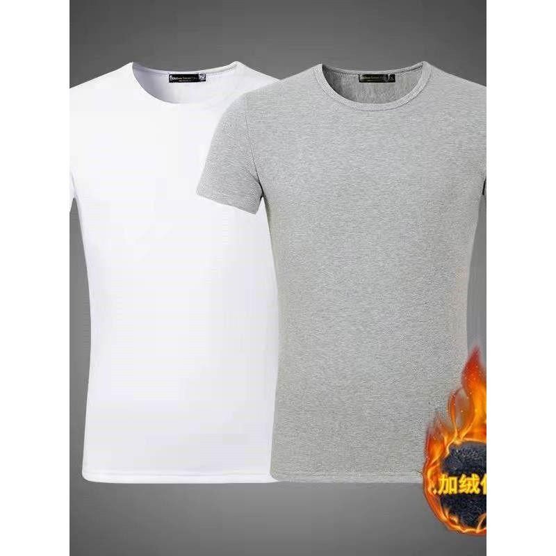 2件】冬季男士加绒短袖t恤圆领纯色打底衫加厚保暖秋衣冬天棉半袖