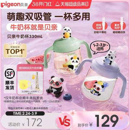 贝亲熊猫牛奶杯1-3岁婴儿童宝宝喝水喝奶双吸管直饮水杯奶瓶正品