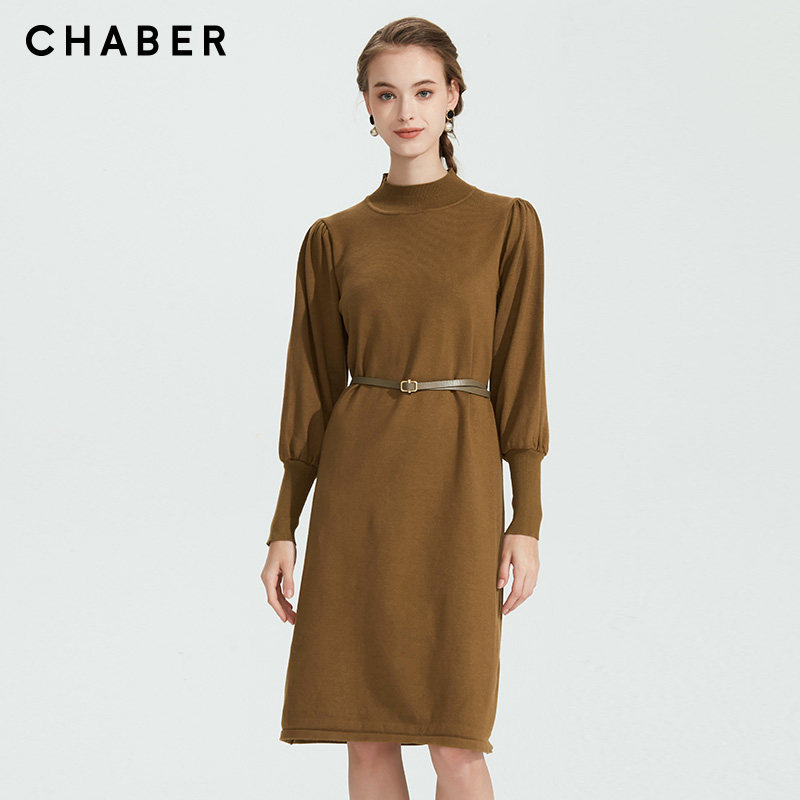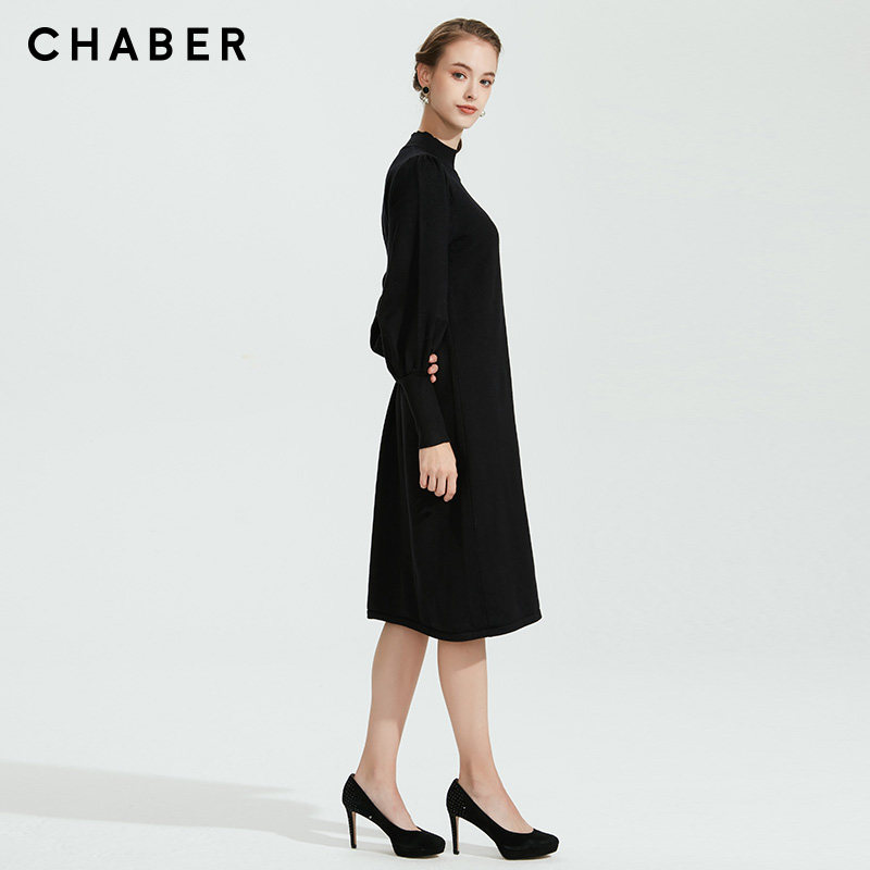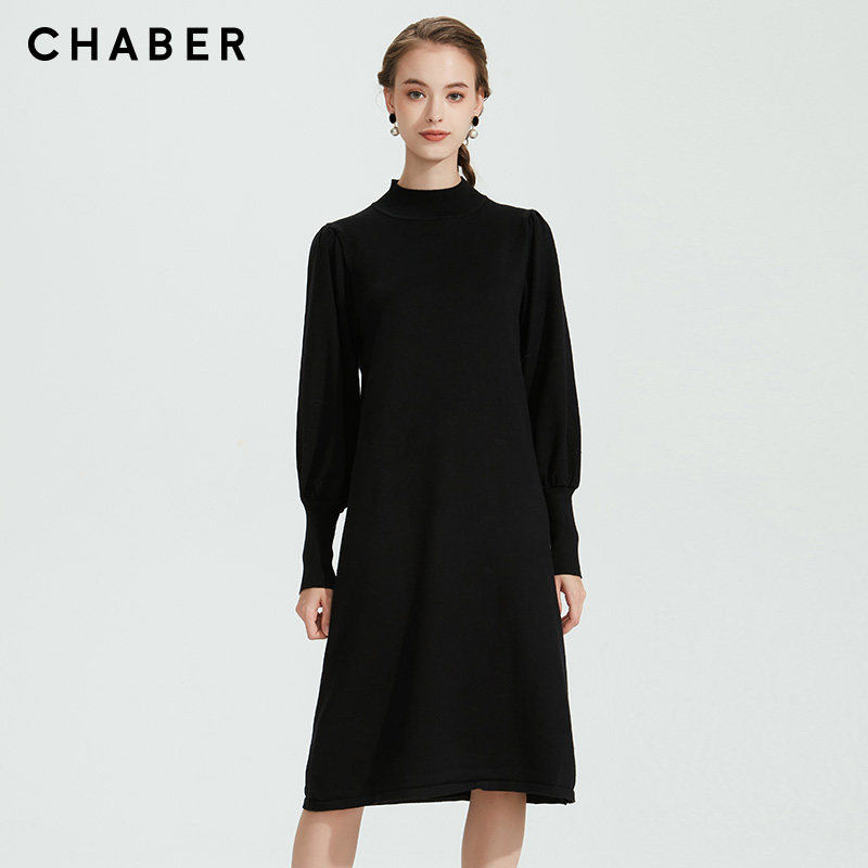 chaber/巧帛2022秋季连衣裙简约高领长袖针织中长款裙子824763