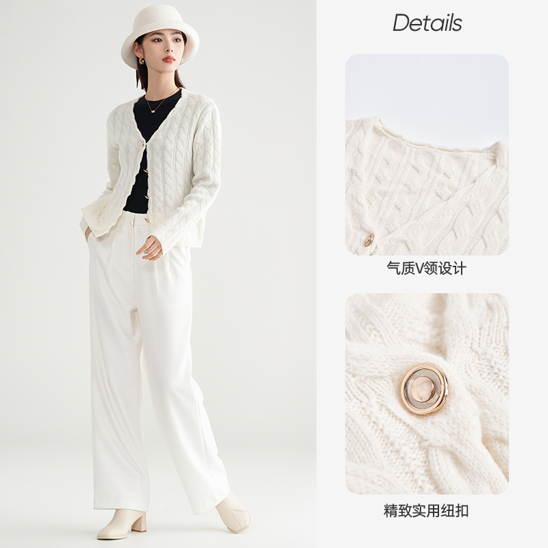 马天奴春秋女装浅灰绵羊毛提花针织开衫V领短款气质百搭时尚简约