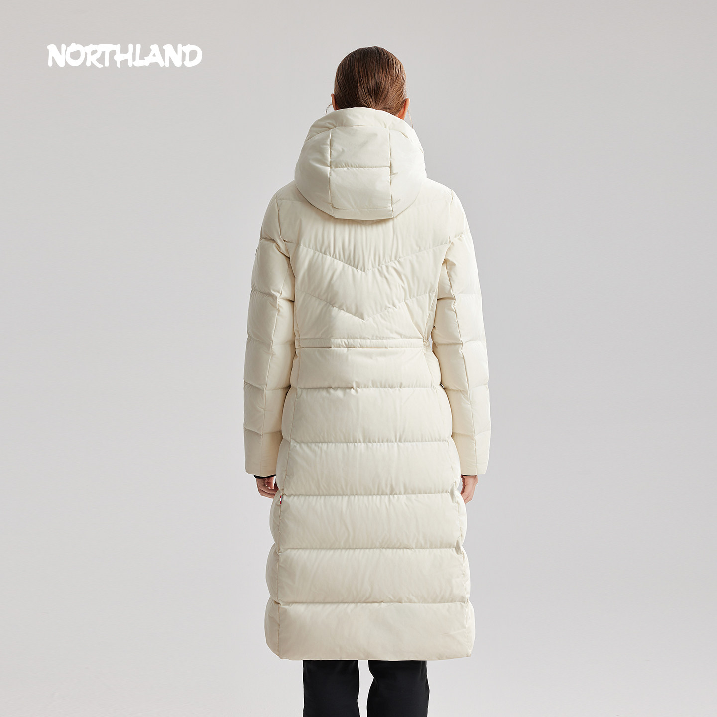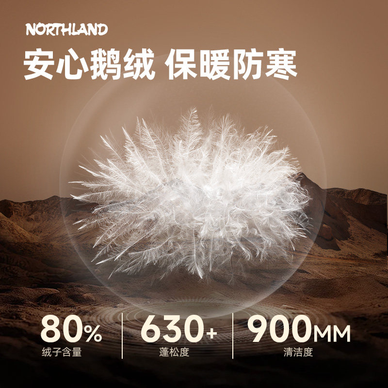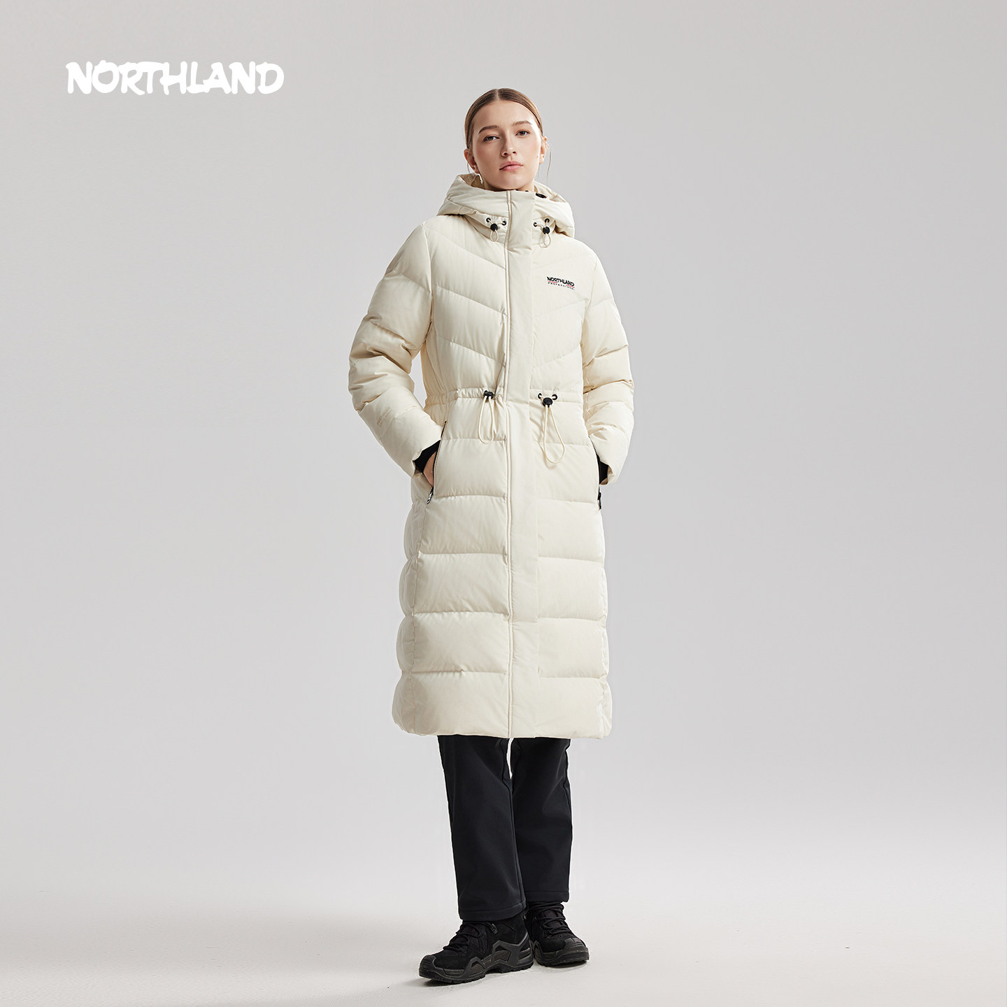诺诗兰鹅绒冬季女户外三防石墨烯保暖抗寒长款收腰连帽外套羽绒服