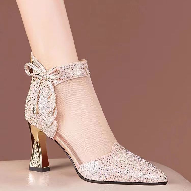 粗跟网纱PU尖头水钻蝴蝶结凉鞋