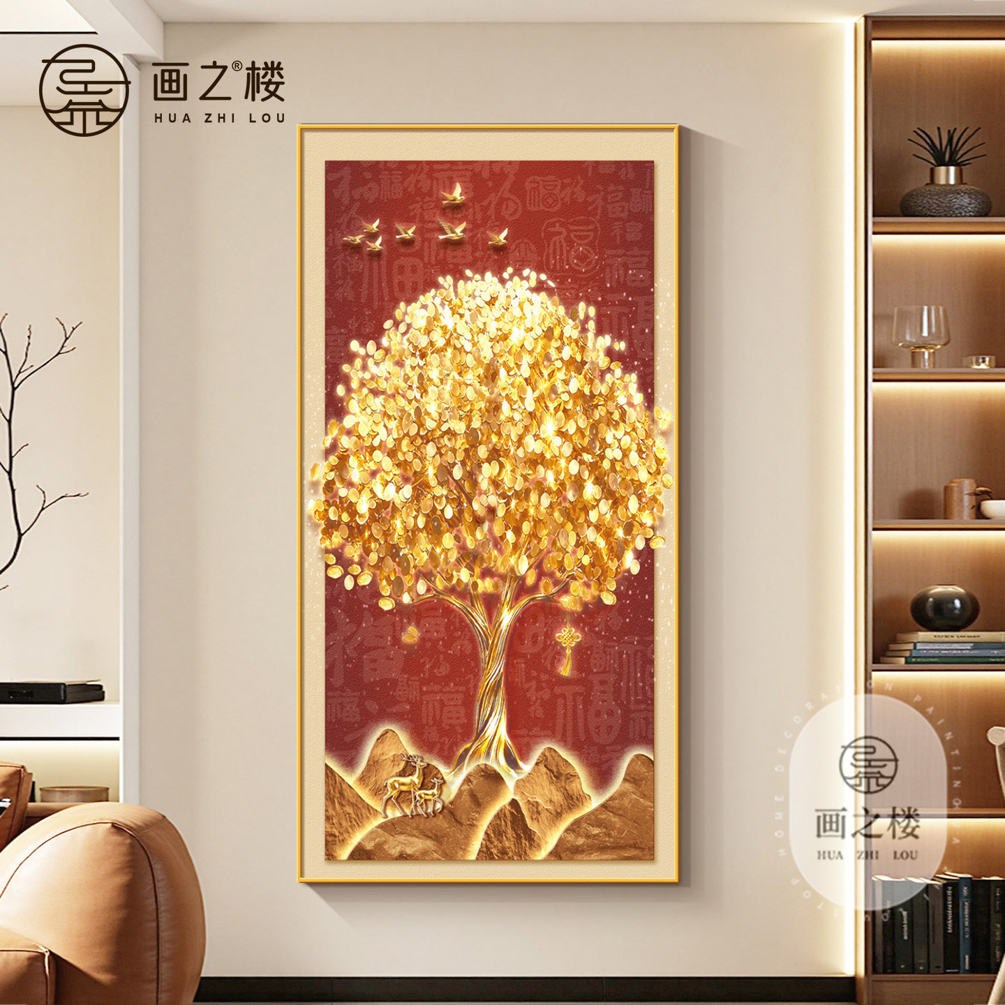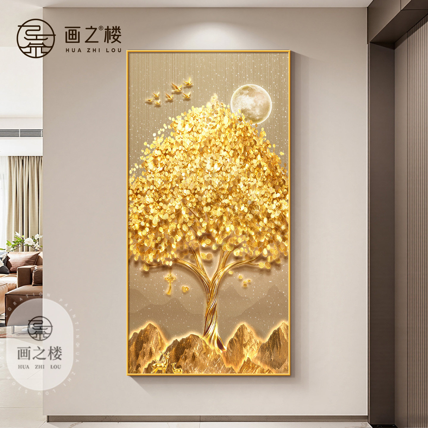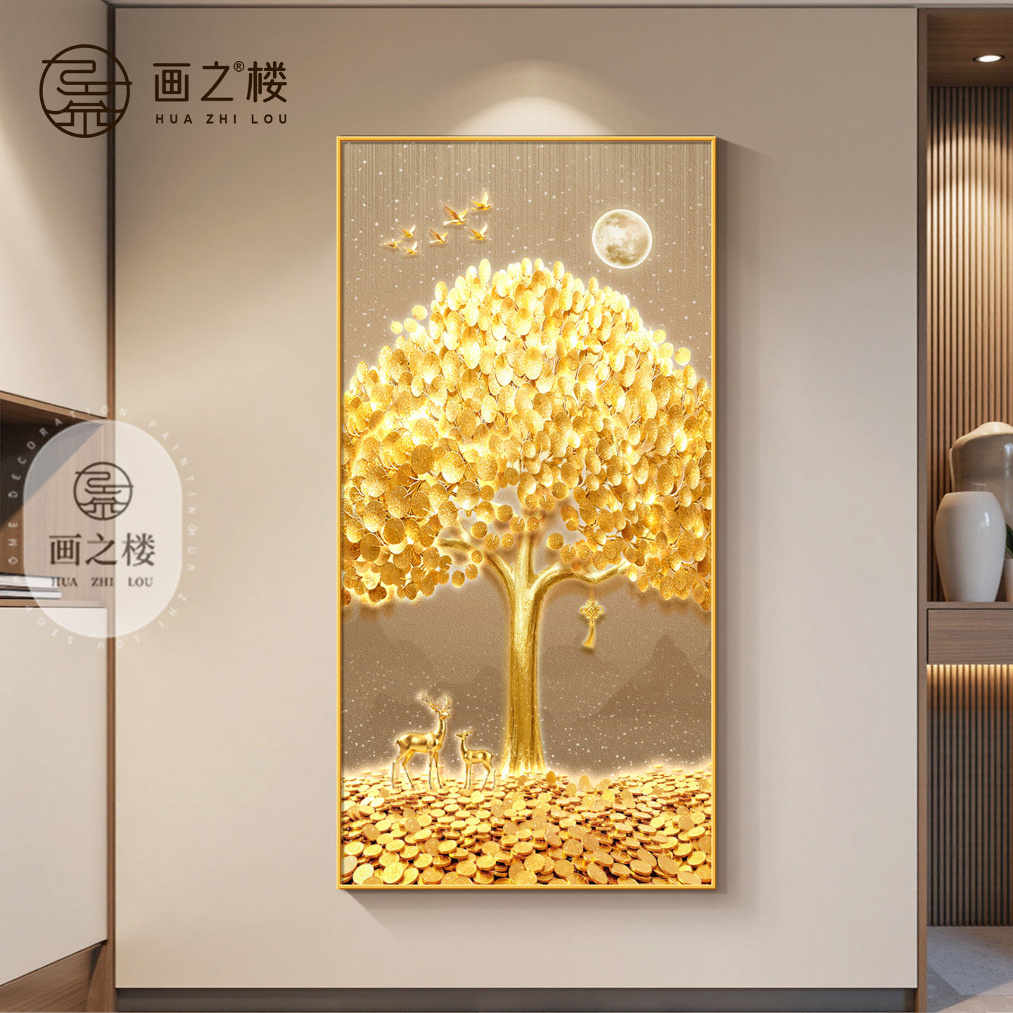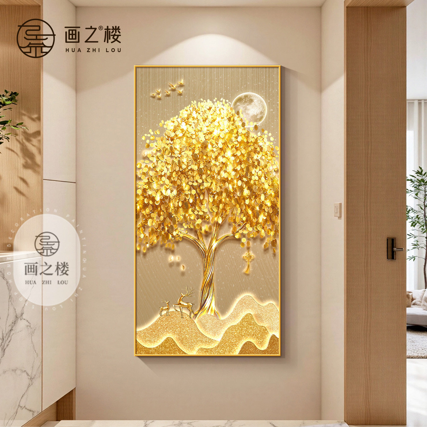 现代轻奢发财树玄关装饰画金色招财树走廊过道挂画聚财入户门壁画