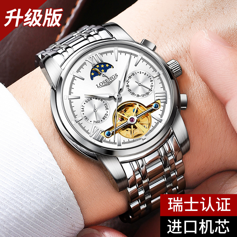 瑞士正品罗西尼手表男士全自动机械表防水夜光多功能镂空商务男表