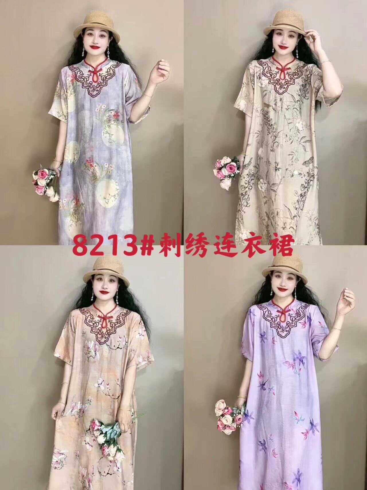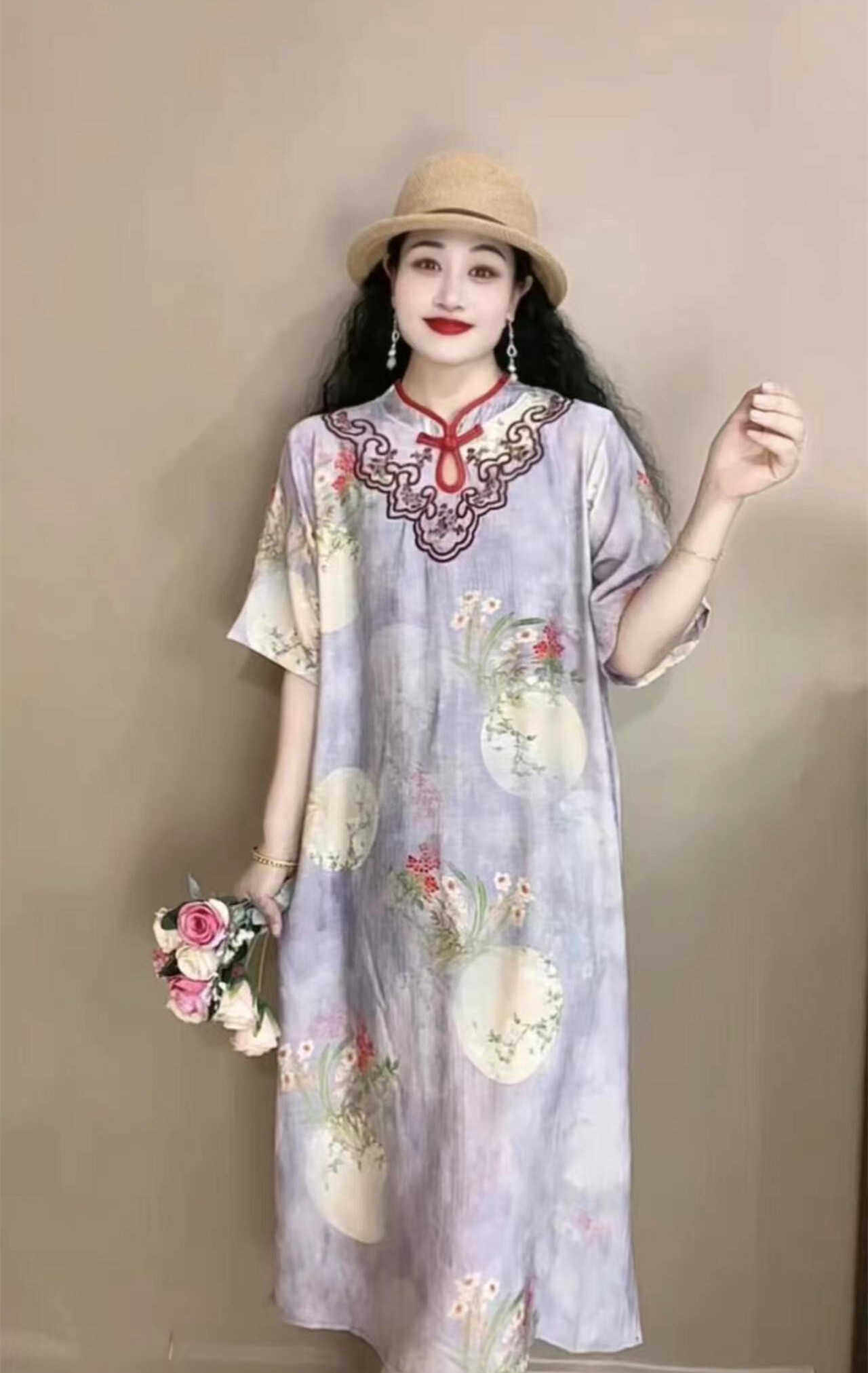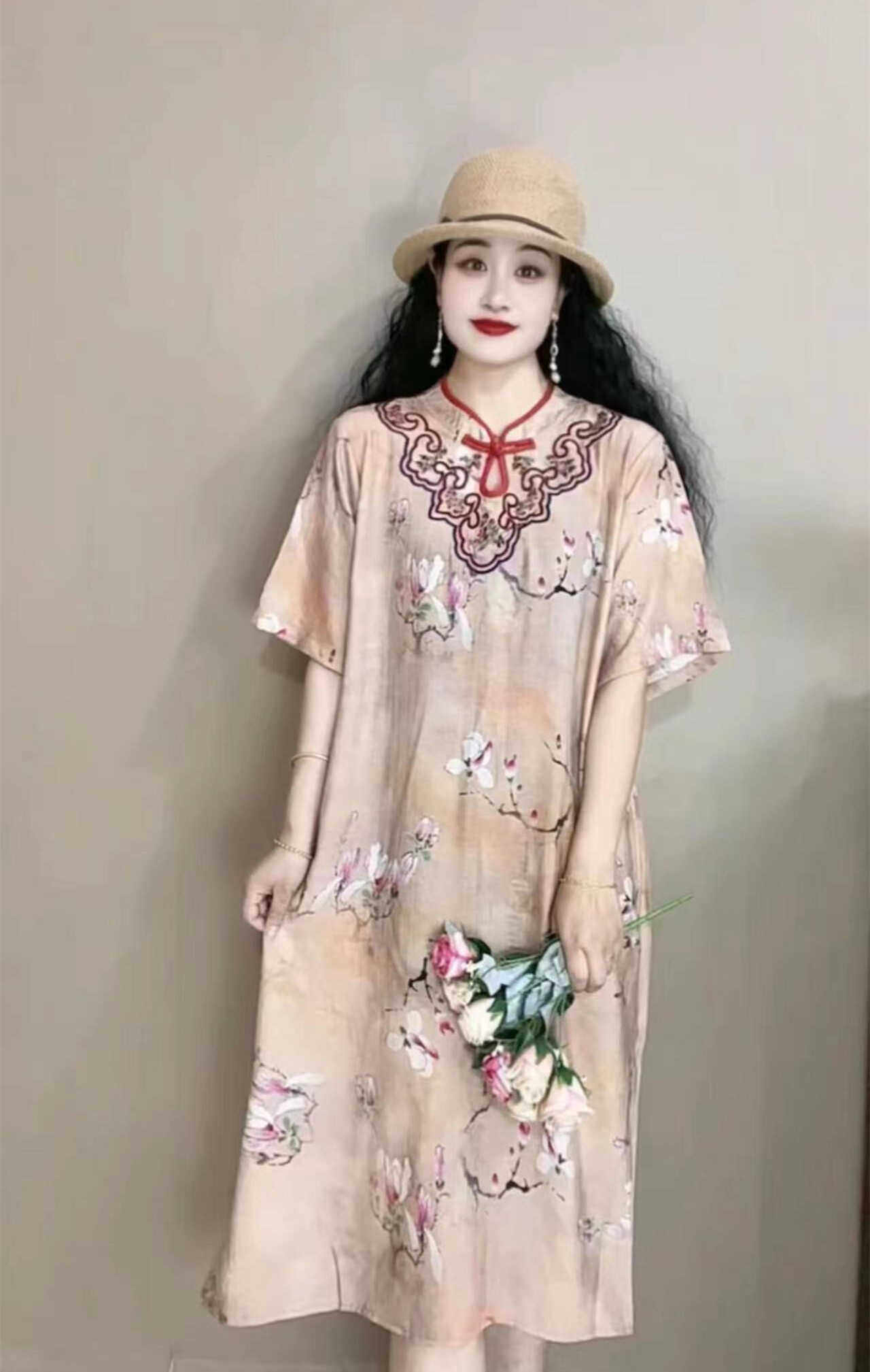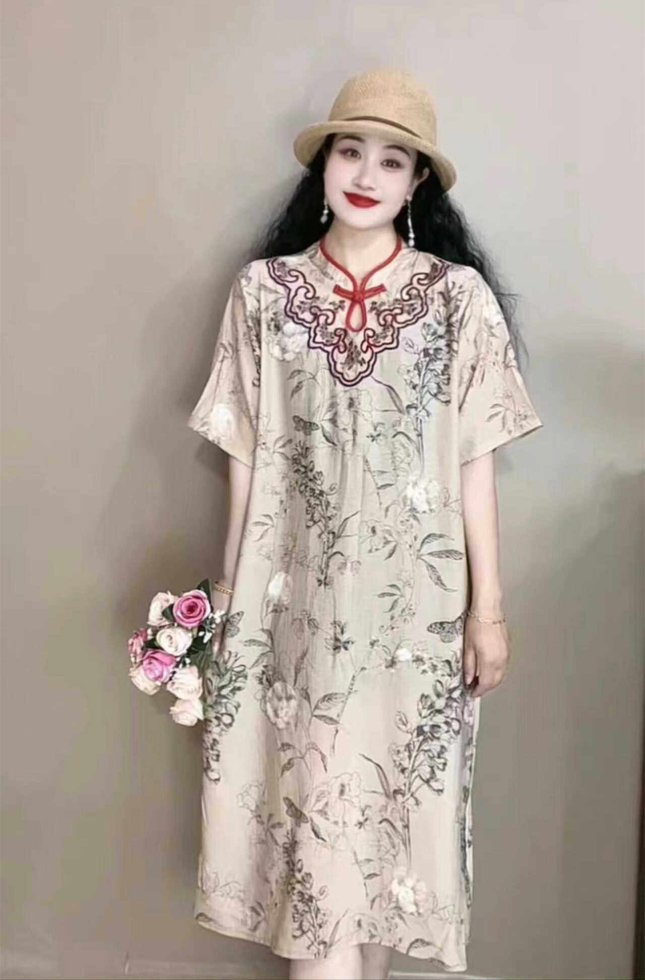 新款复古中式盘扣改良连衣裙女精致刺绣印花旗袍丝麻长裙夏F13#