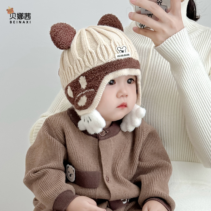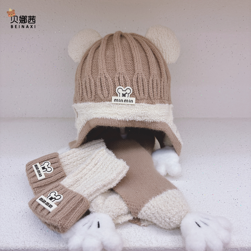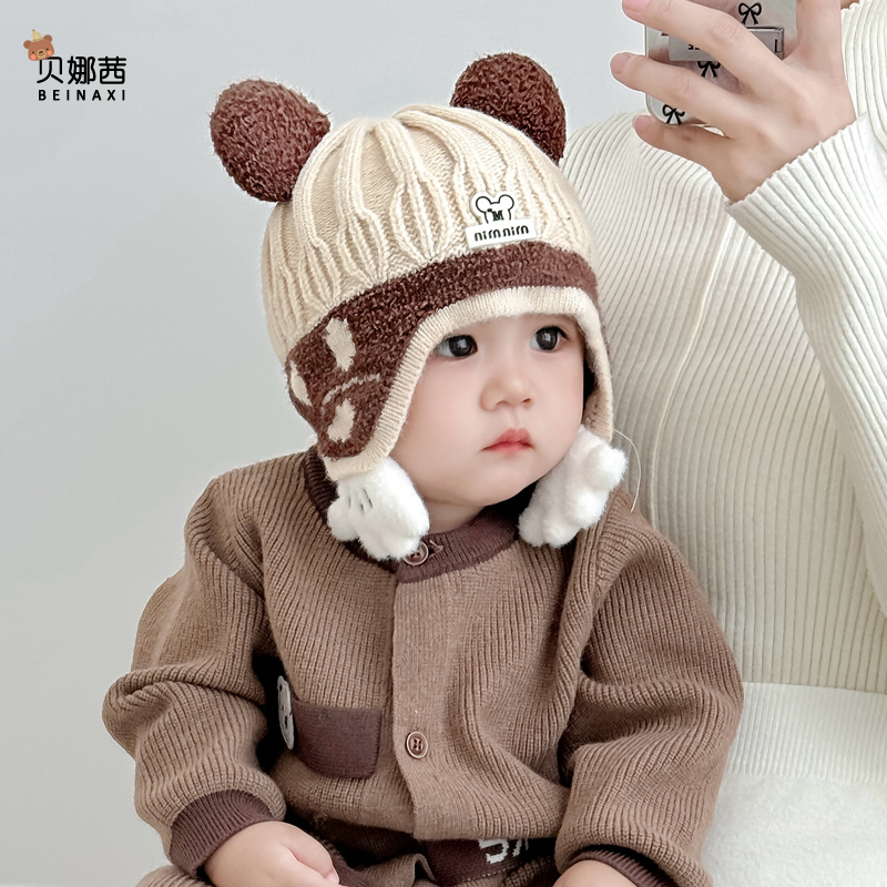 婴儿帽子秋冬季男宝宝男童针织帽围巾儿童护耳帽小月龄加厚毛线帽