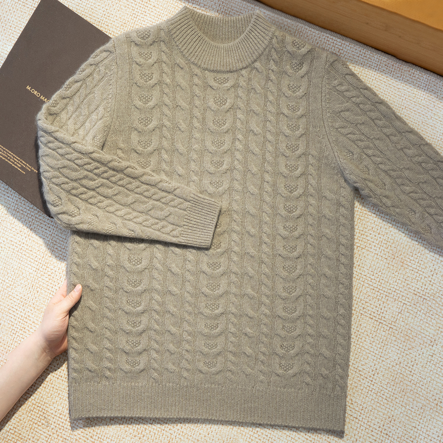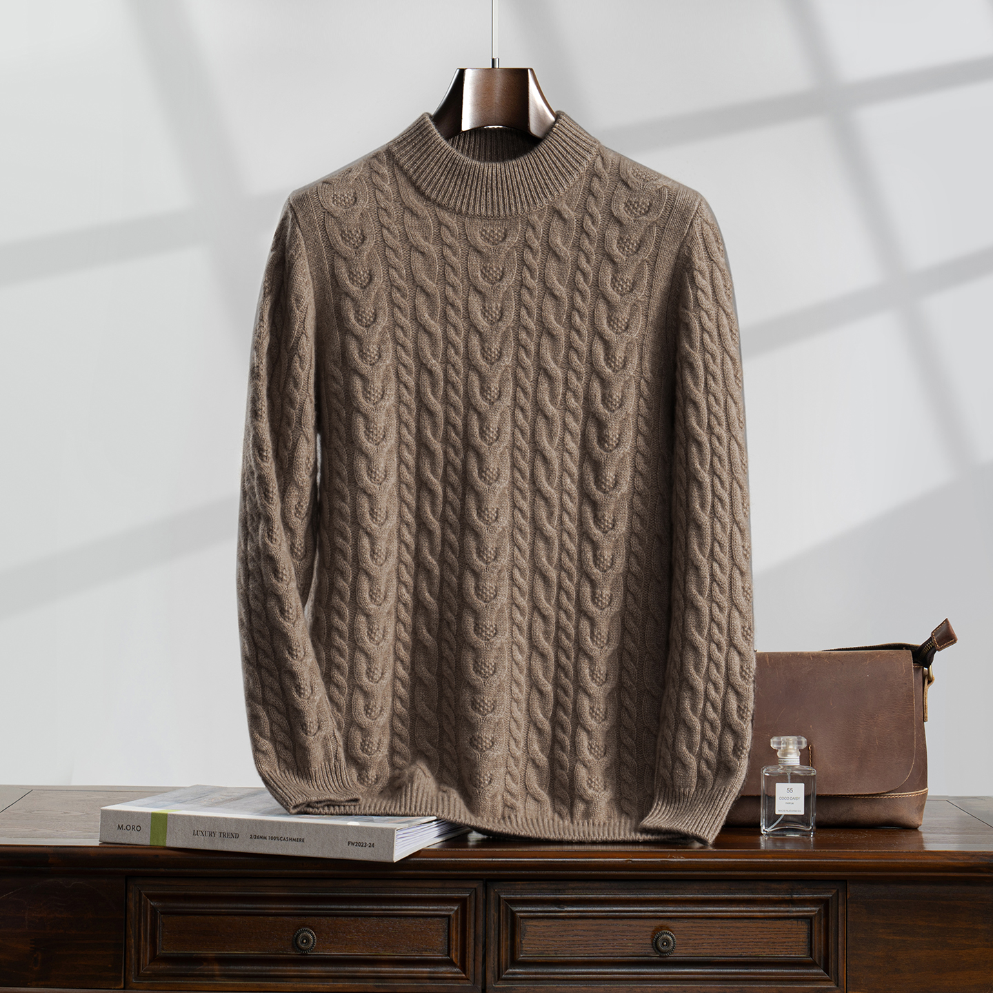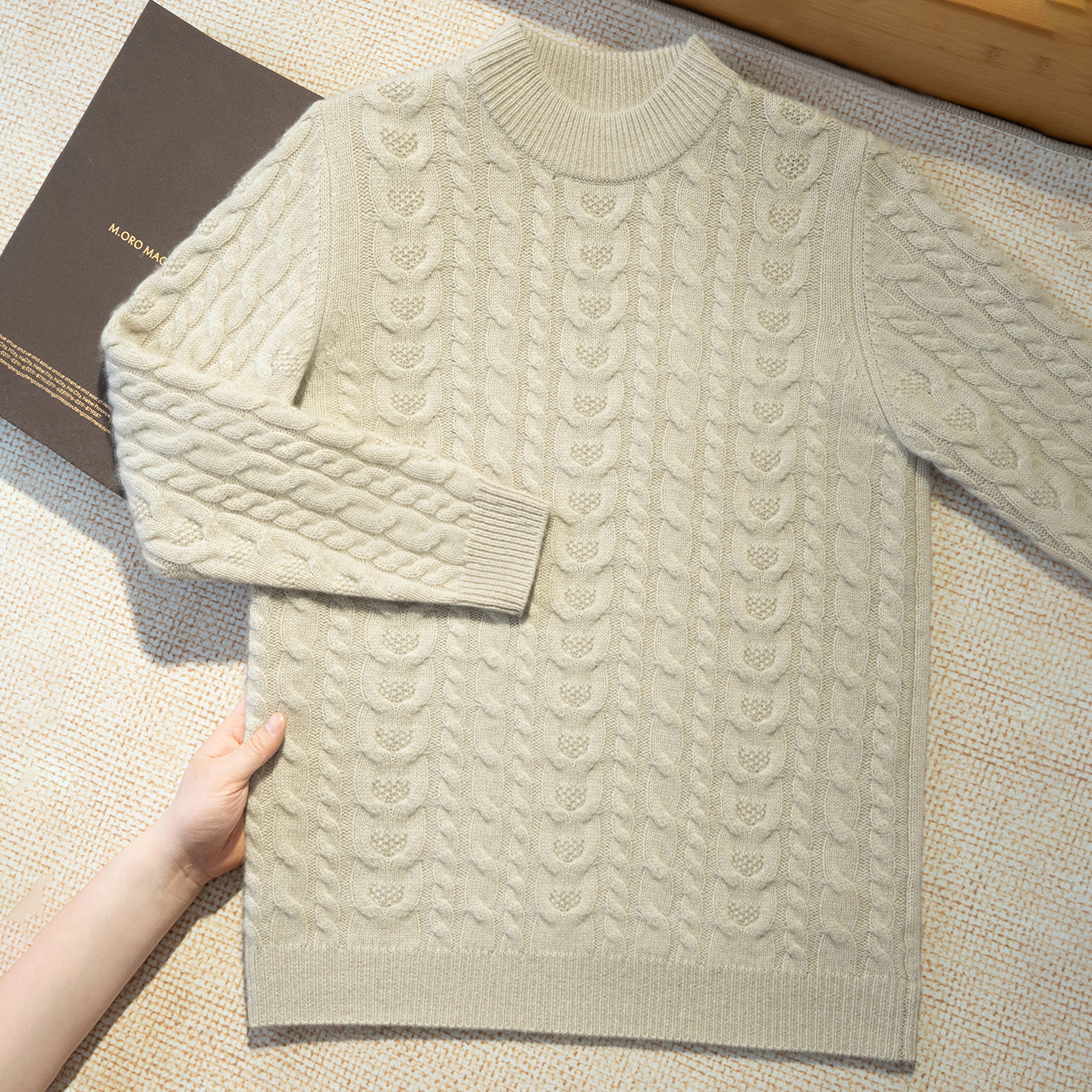 五针三股重磅扭花100纯山羊绒衫男士套头半高领加厚秋冬青年毛衣