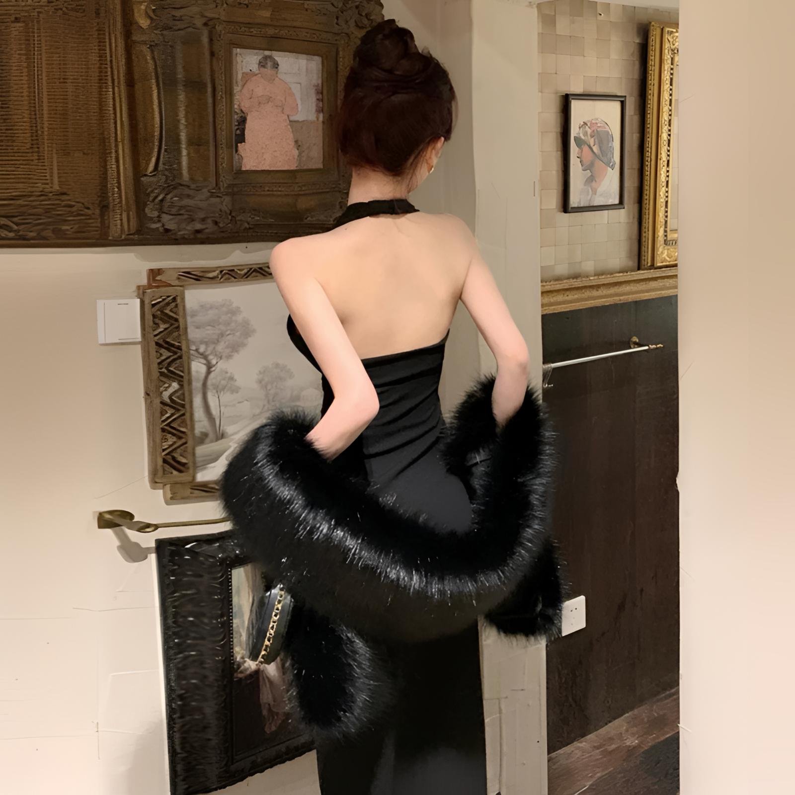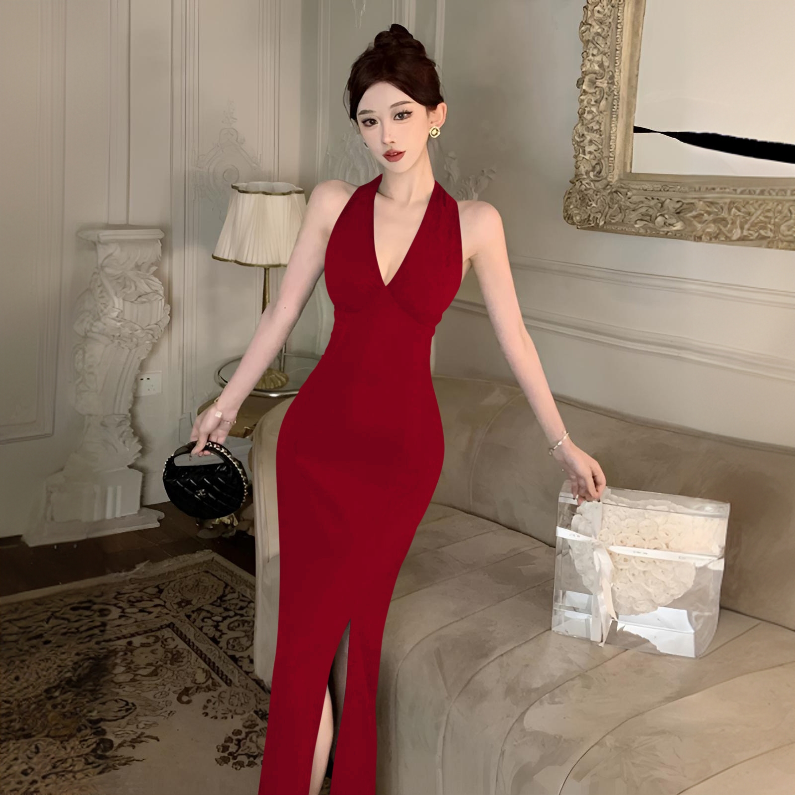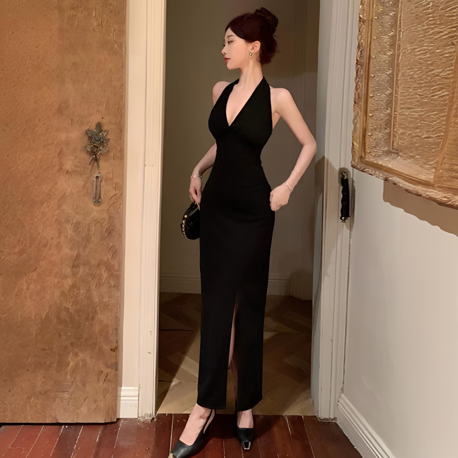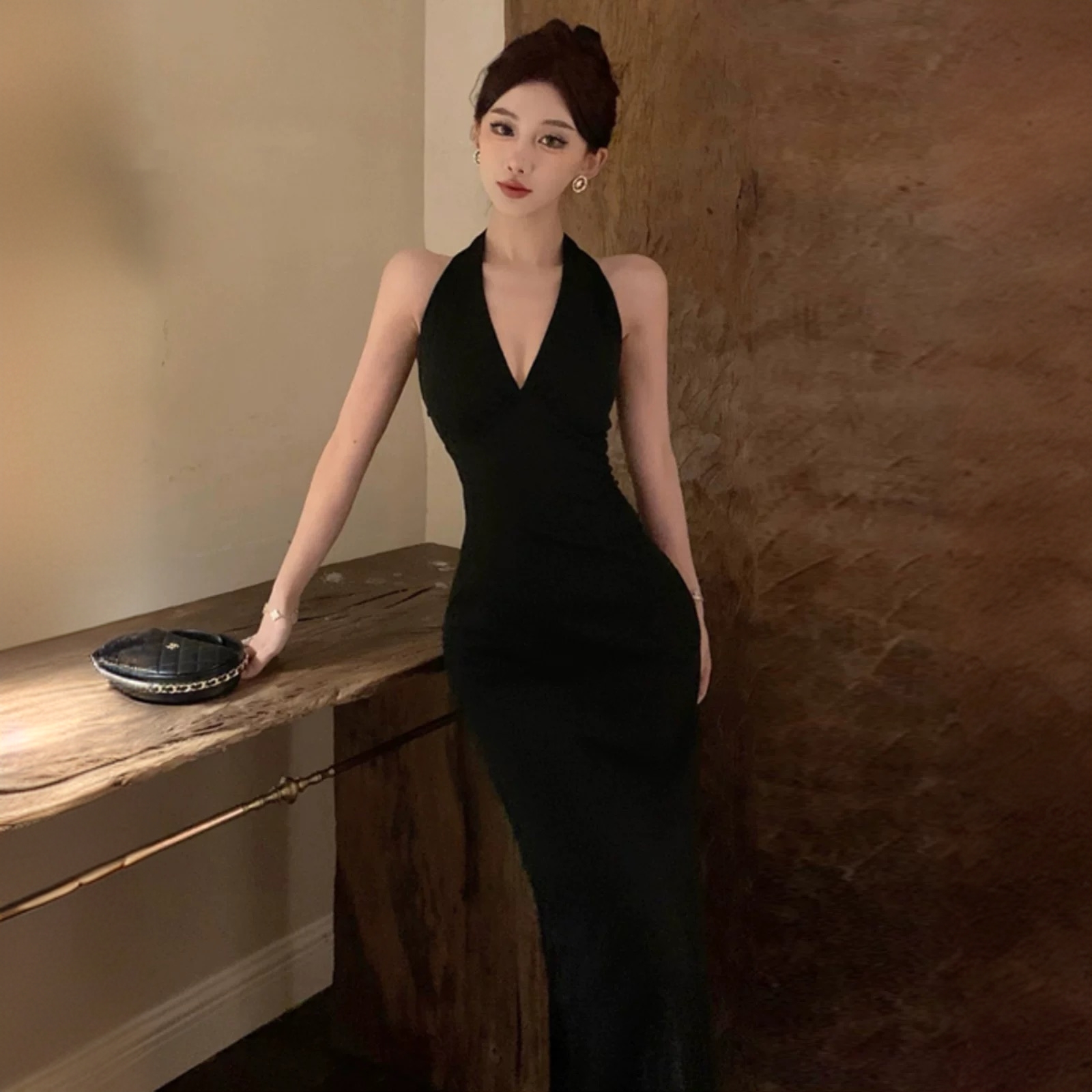 御姐范挂脖气质辣妹小黑裙收腰显身材法式性感修身包臀无袖连衣裙
