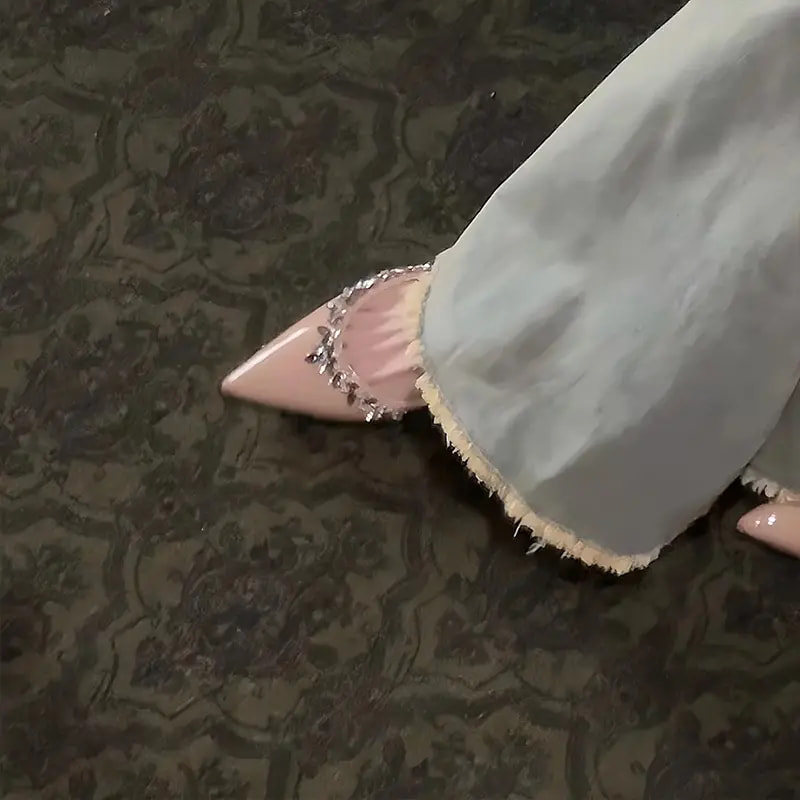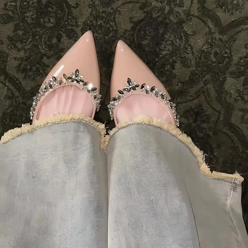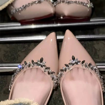meichen/美晨5cm裸色高跟鞋女水钻漆皮平底鞋气质尖头不累脚单鞋