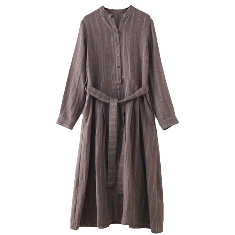 春秋季新款系带收腰显瘦高端原创亚麻色织条纹长款连衣裙长袖长裙