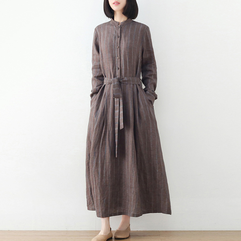 原创亚麻色织条纹长款连衣裙