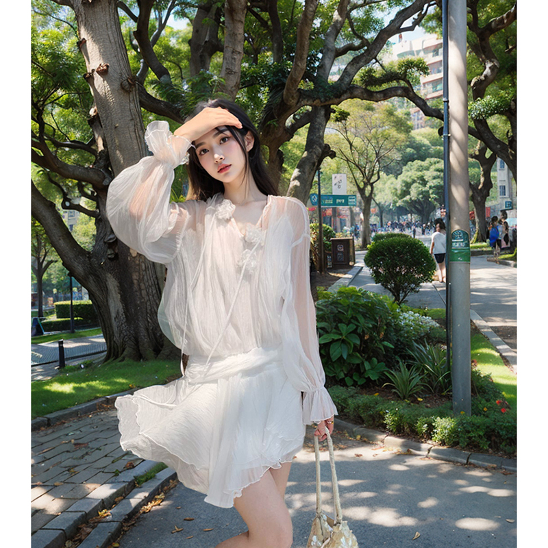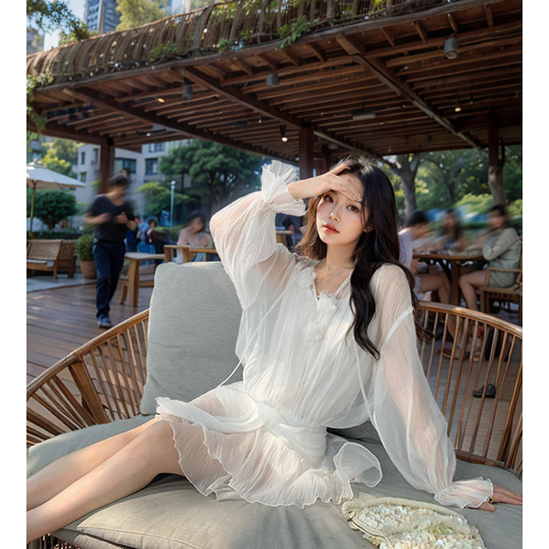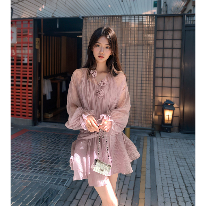 鸢尾紫烟 飘带花朵连衣裙短款春夏新款气质温柔v领长袖收腰短裙