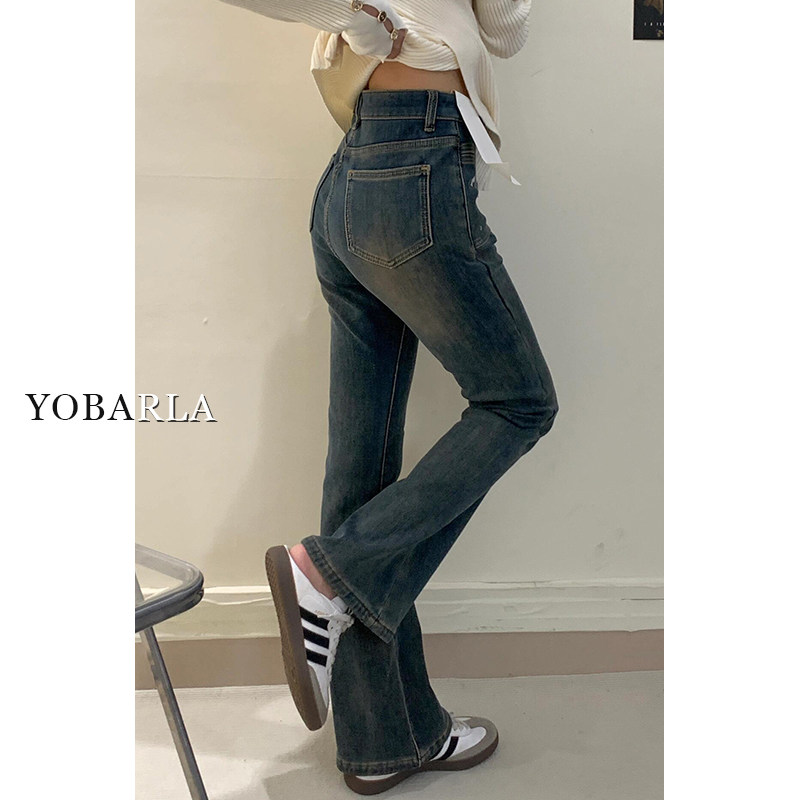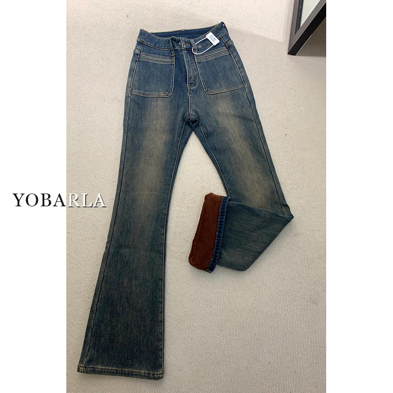 复古微喇牛仔裤女秋冬加绒胖mm大码显瘦梨形身材弹力喇叭马蹄裤子