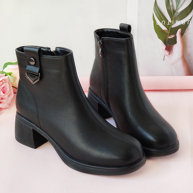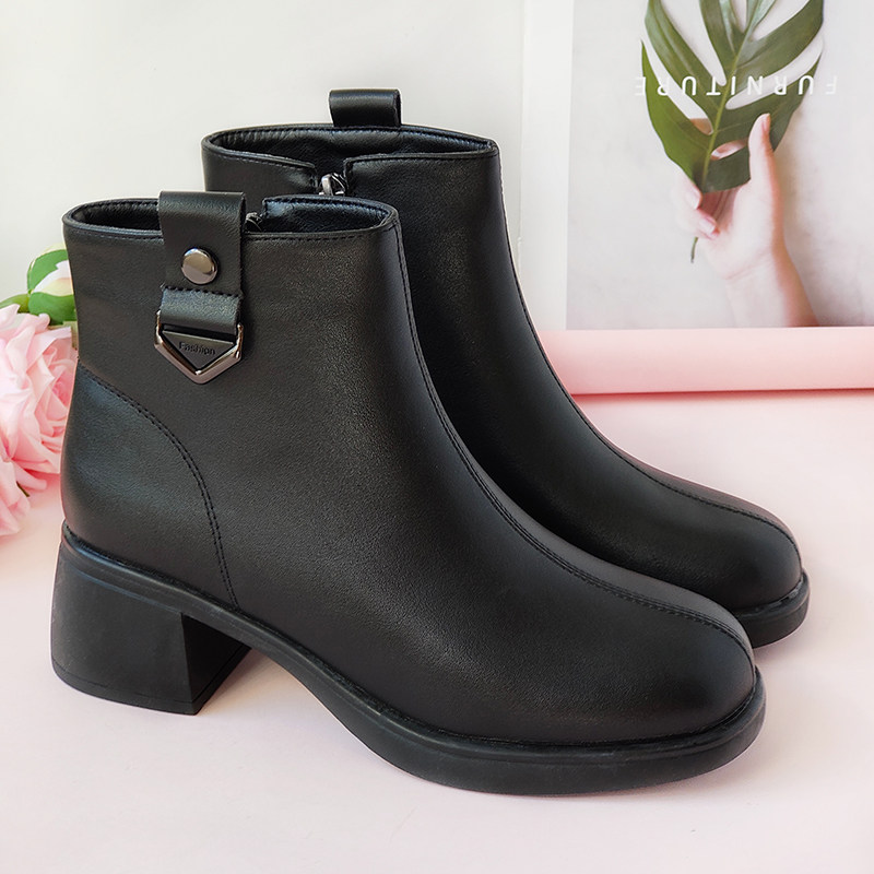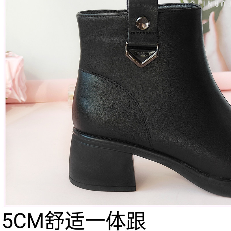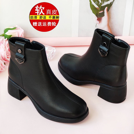 断码俏大东真皮短靴女2025秋冬新款粗跟软底马丁靴加绒妈妈鞋皮鞋