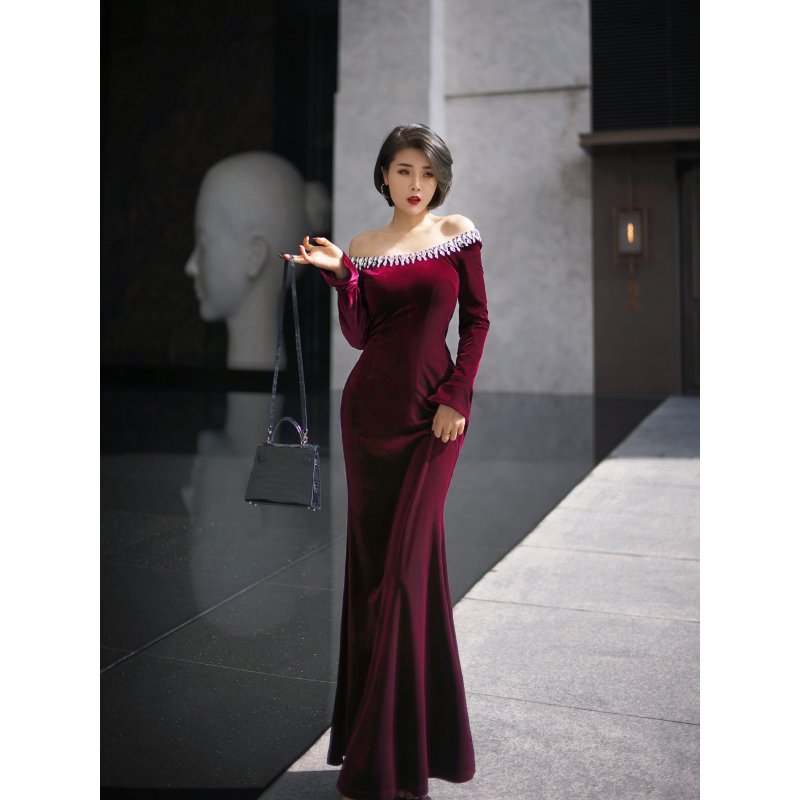 XULU原创轻奢法式丝绒优雅鱼尾裙气质性感小众黑色修身长袖连衣裙