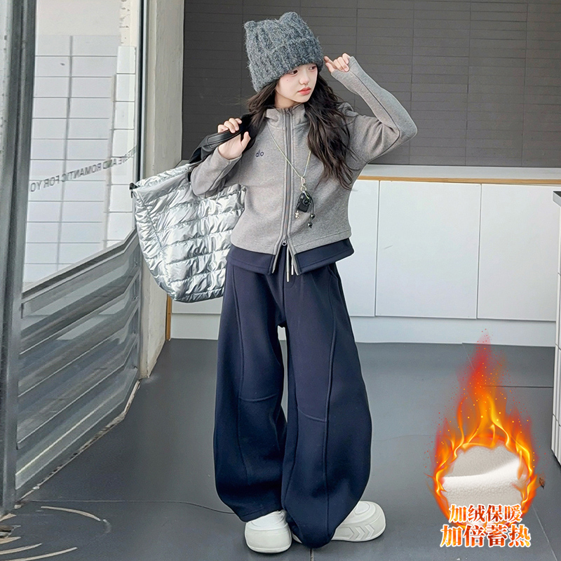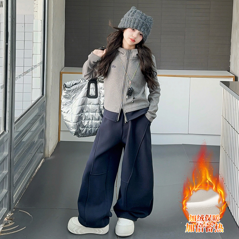 女童秋冬加绒卫衣套装儿童独特双拉链卫衣外套阔腿裤中大童两件套