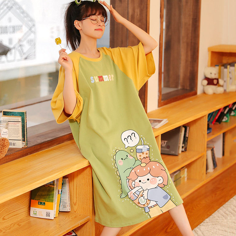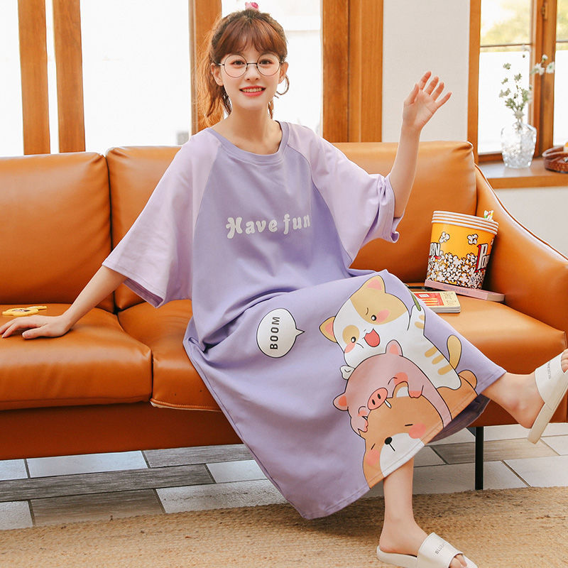 夏季女士睡裙短袖纯棉大码薄款睡衣女夏孕妇宽松可爱家居服中长款