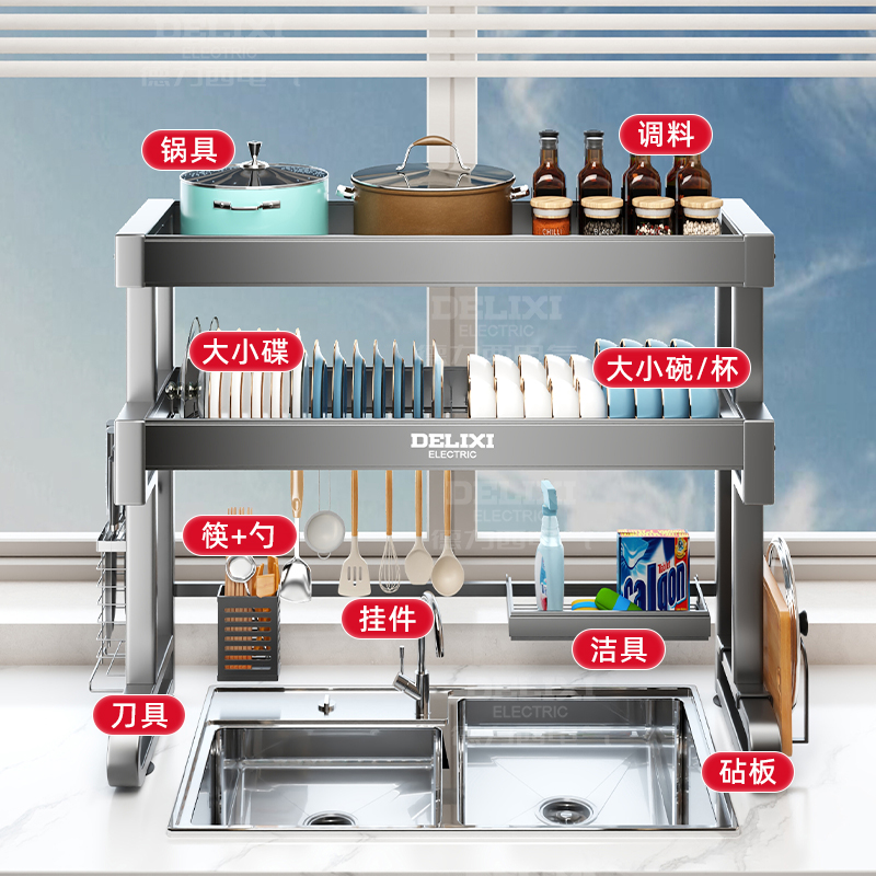 德力西不锈钢厨房置物架碗碟收纳水槽水池上方多功能放碗盘沥水架