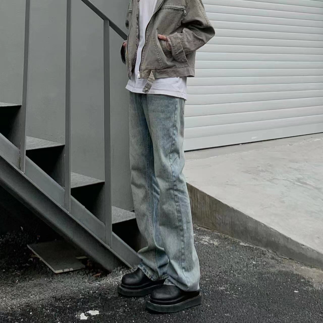 阿叔潮牌美式高街vibe微喇直筒牛仔裤男春秋百搭休闲水洗修身裤子