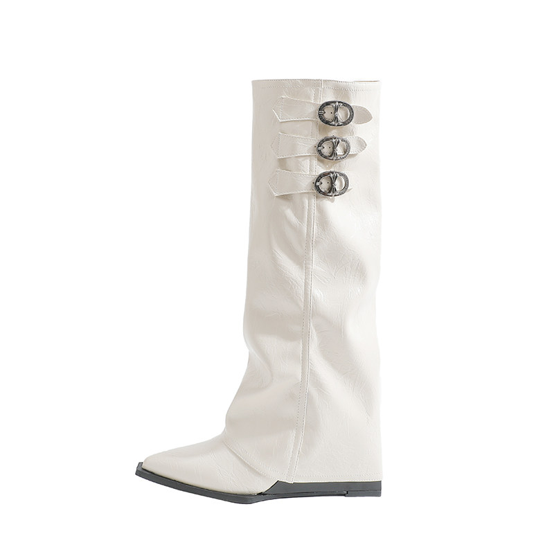 真皮~骄屿法式尖头坡跟骑士靴辣妹皮带扣裤管靴高筒不过膝长筒靴
