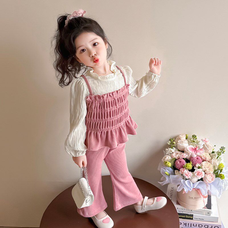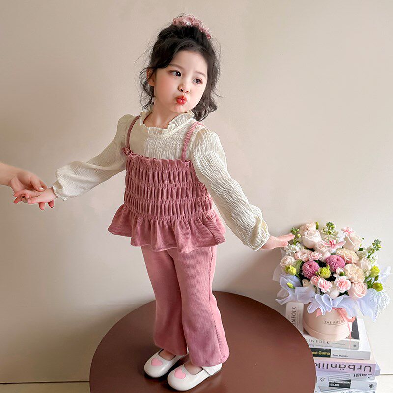 女童假两件衬衫套装2025新款女孩喇叭裤两件套宝宝设计感韩版春装
