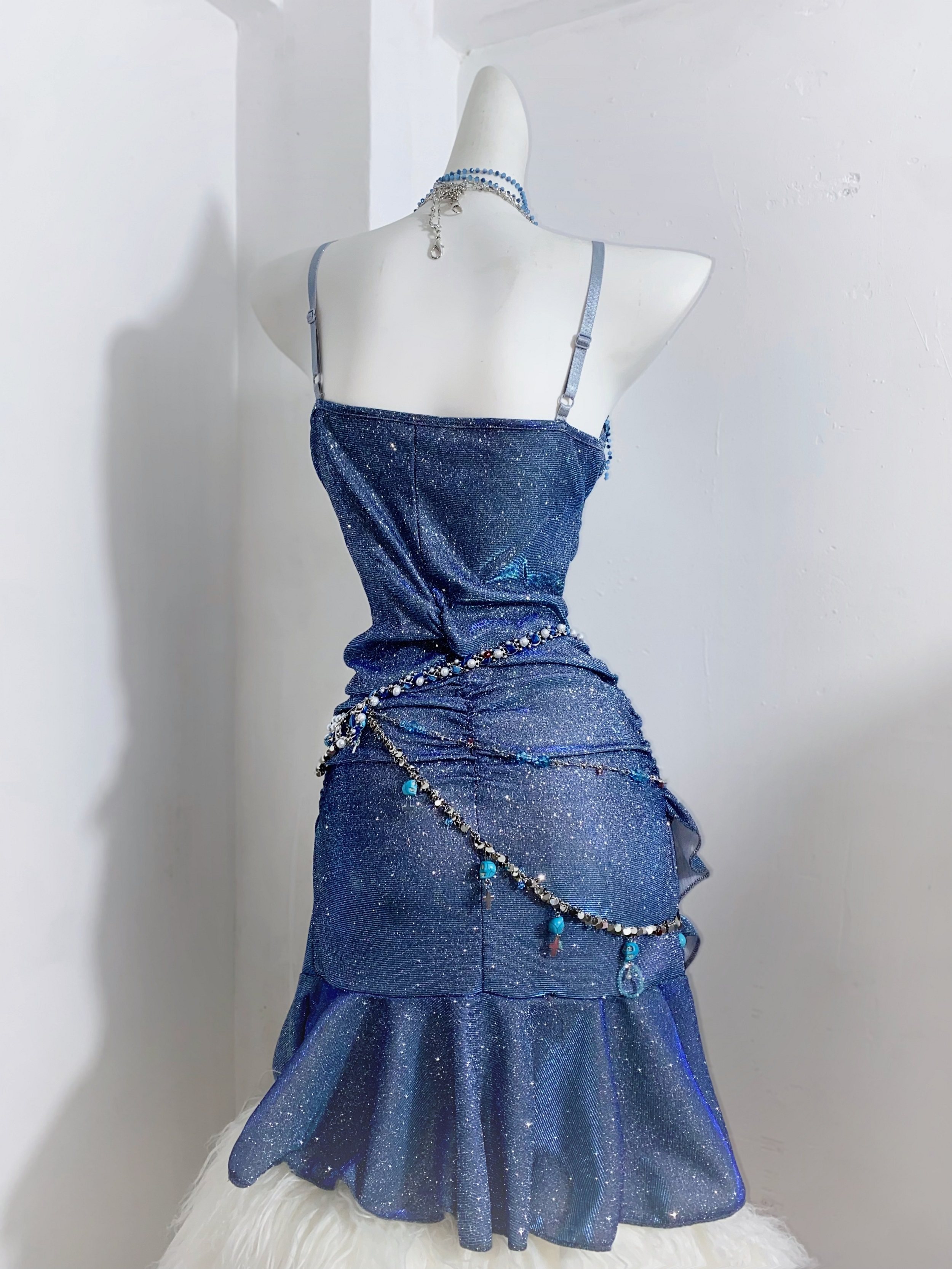 蓝色大海的传说原创蓝偏光绿色昭和公主性感包臀鱼尾连衣裙礼服裙