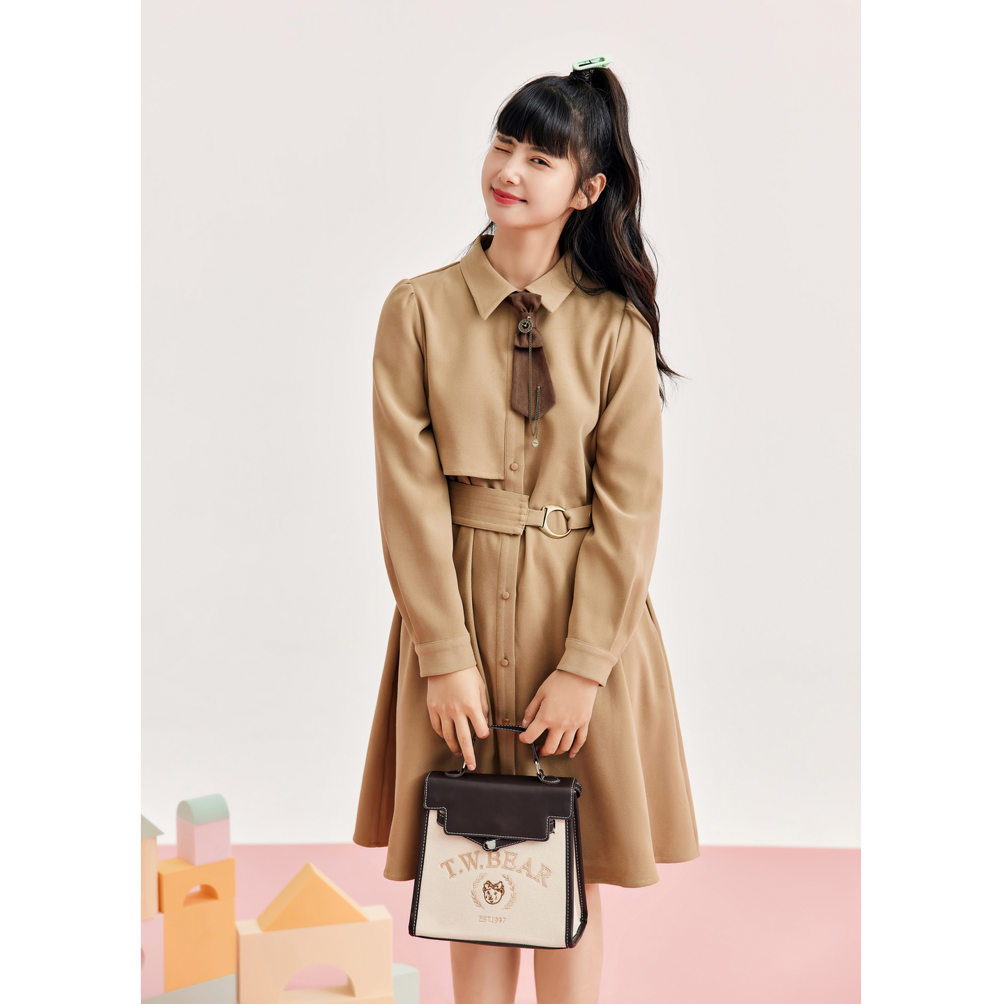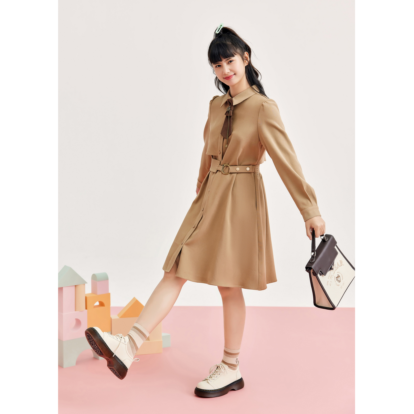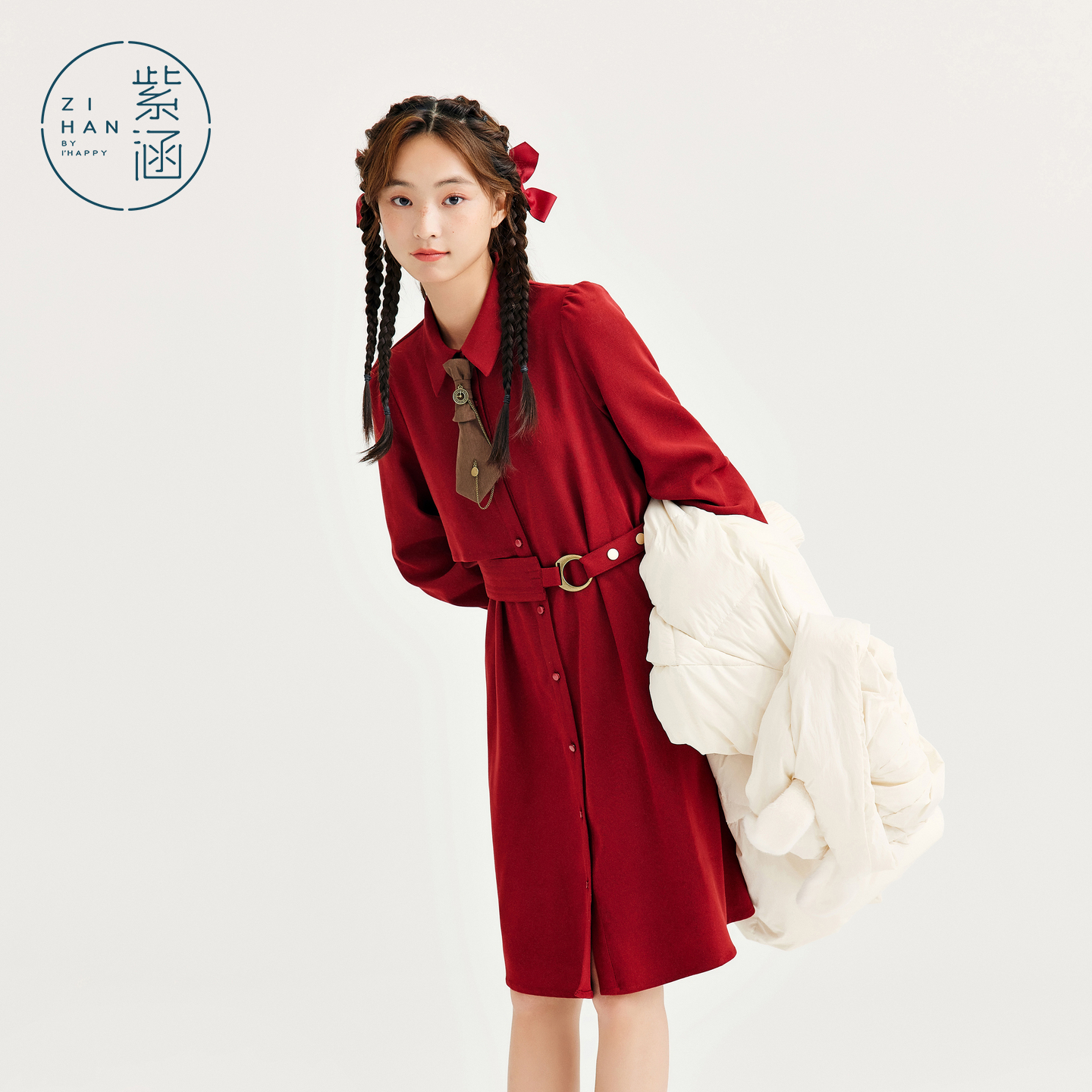 紫涵衬衫领中长款连衣裙女秋冬新款文艺复古收腰宽松长袖A字裙子