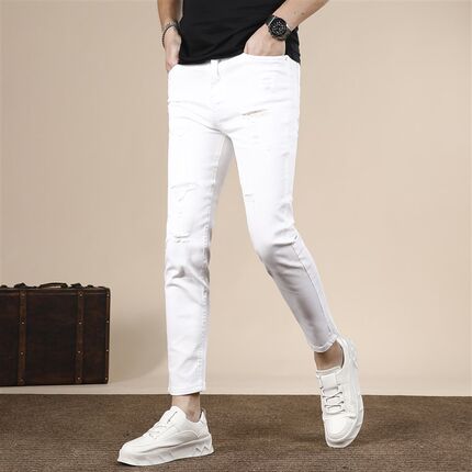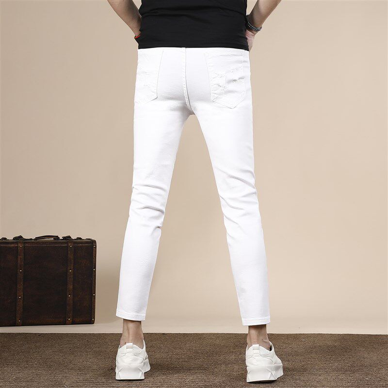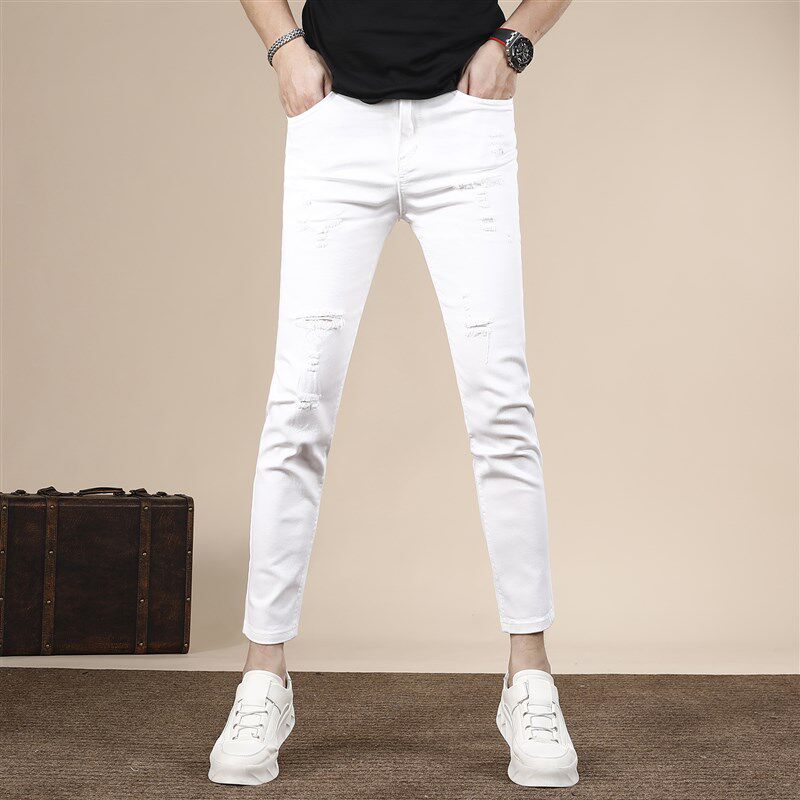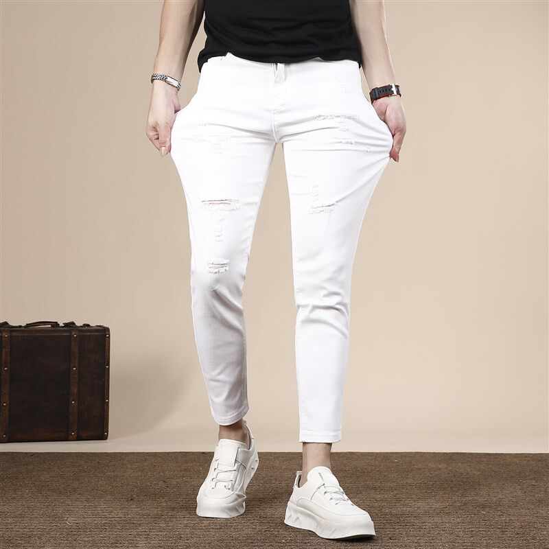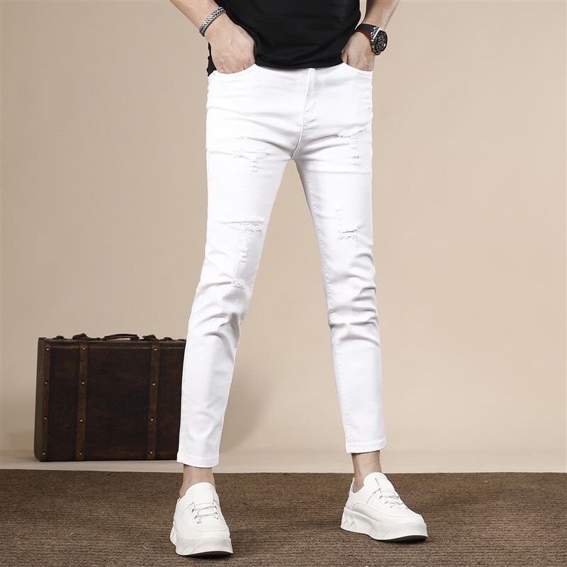 破洞九分牛仔裤男款夏季薄款修身小脚裤白色潮流百搭男士裤子9分