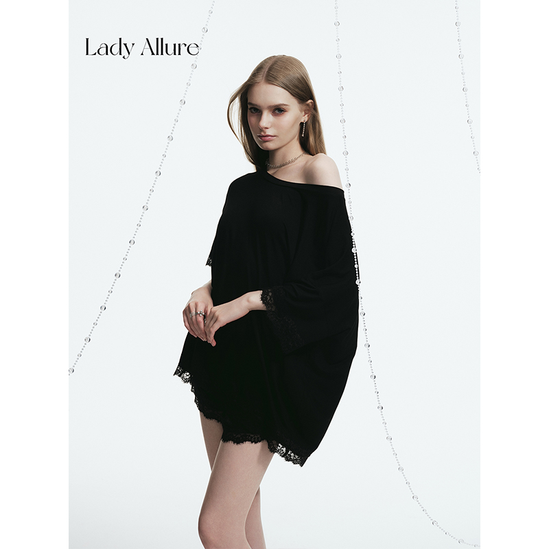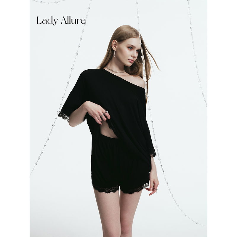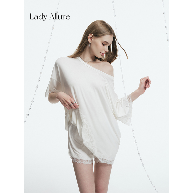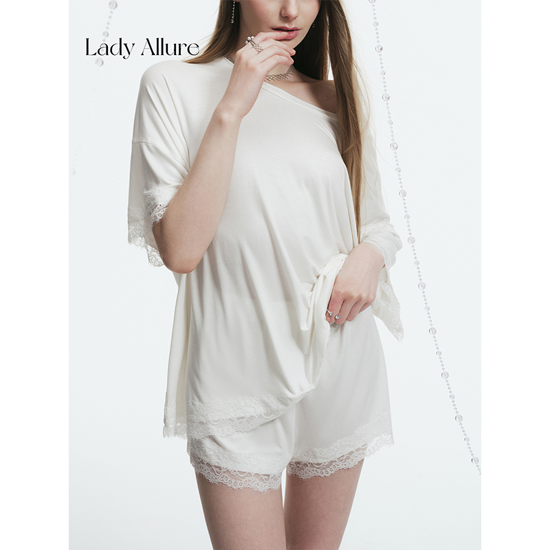 「LA」温婉姐姐*FMZ*原创设计韩版宽松斜肩蕾丝短袖T恤女睡衣套装