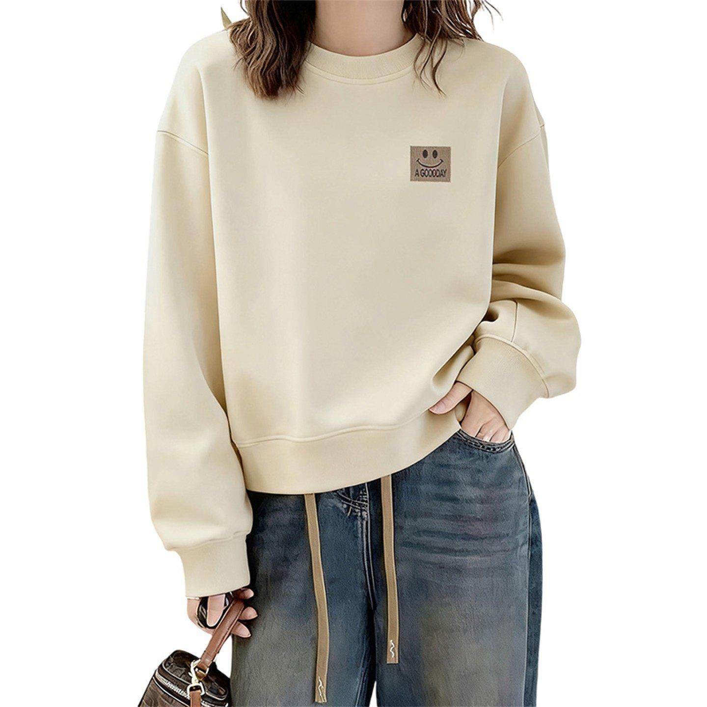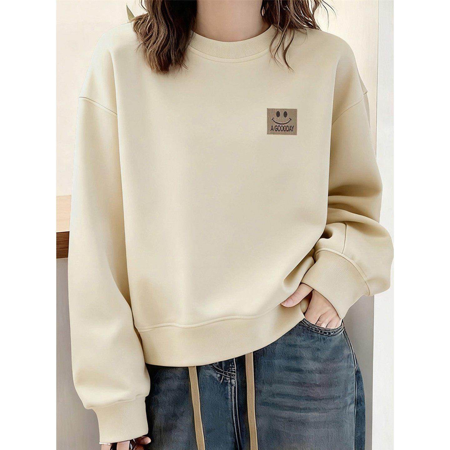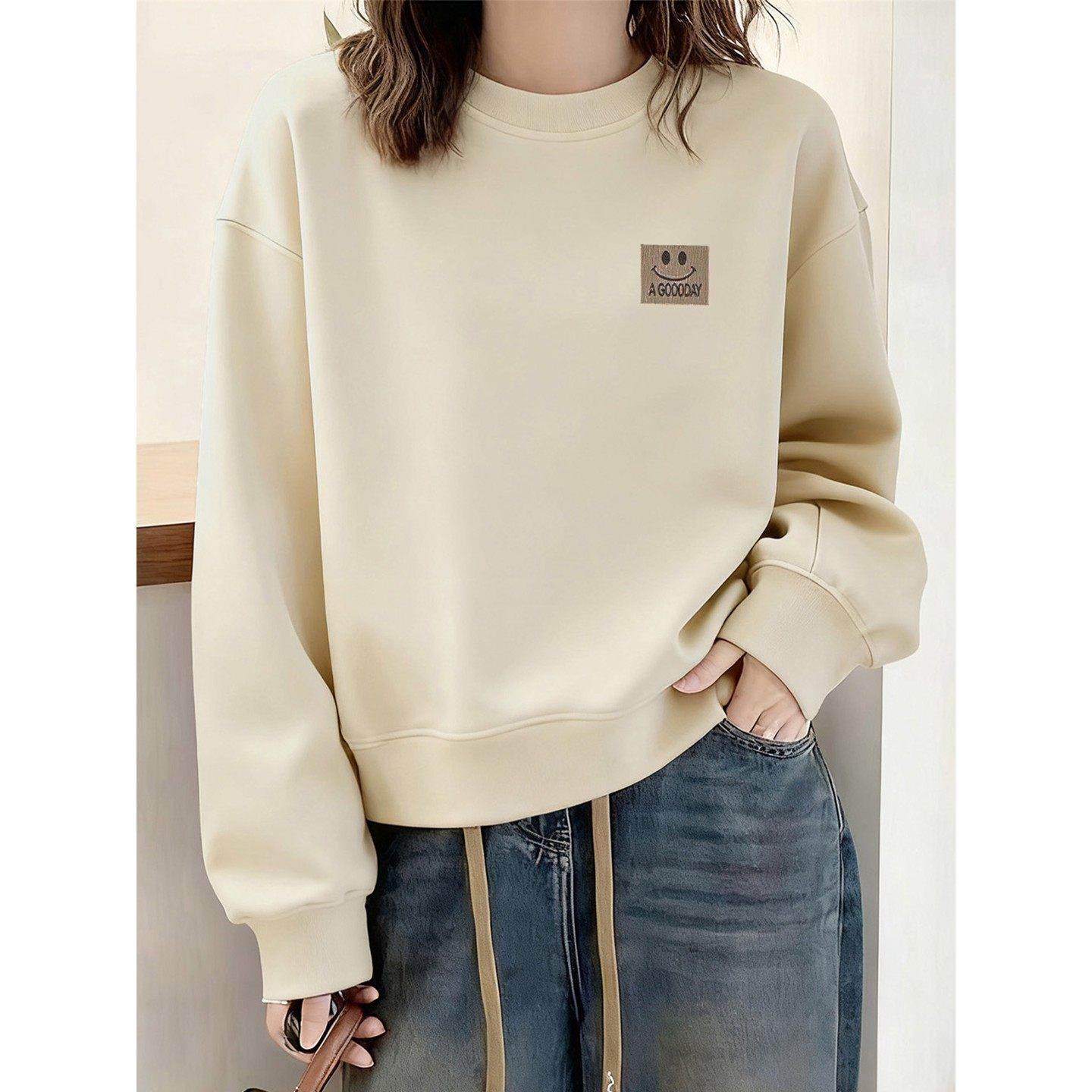 欧货纯棉圆领短款杏色卫衣女秋冬新款时尚洋气小个子套头长袖上衣