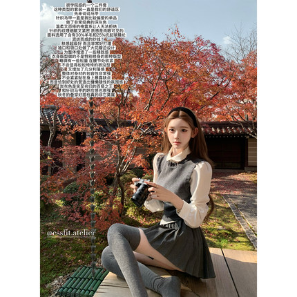 迟伞伞26/ss 校花指南 深灰针织背心元宝领白衬衫灰色百褶裙套装
