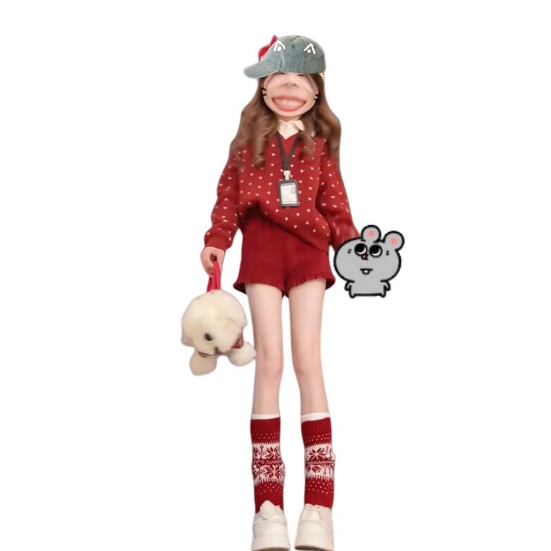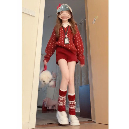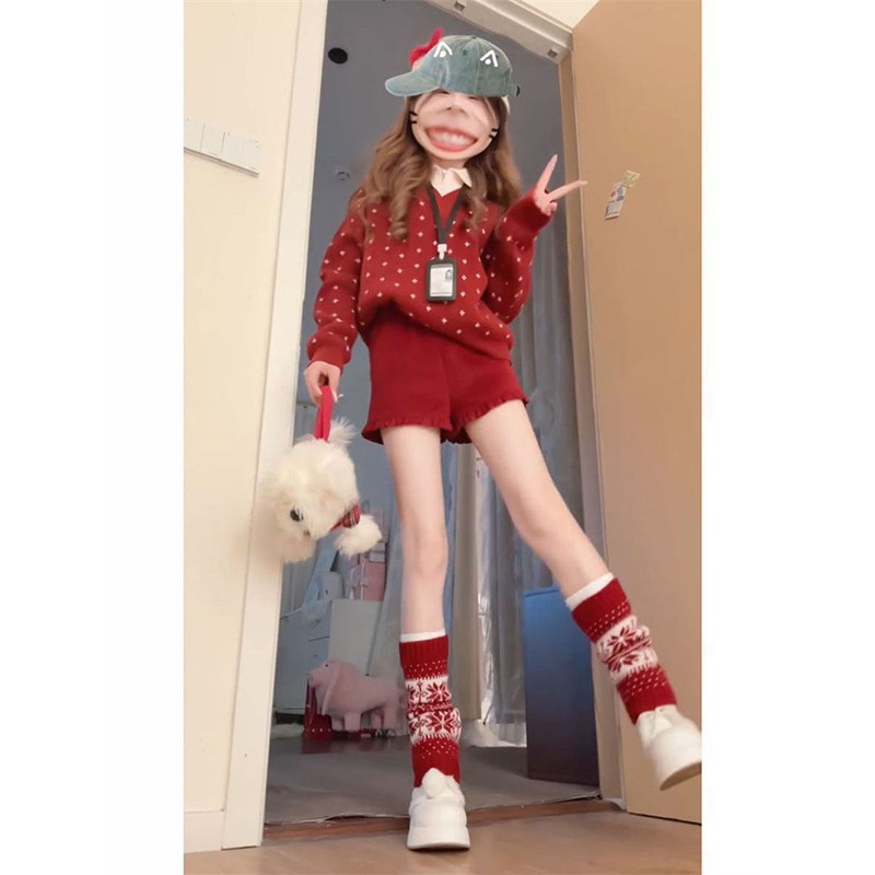 韩系甜酷可爱翻领假两件星星提花毛衣+新年红色高腰短裤两件套装