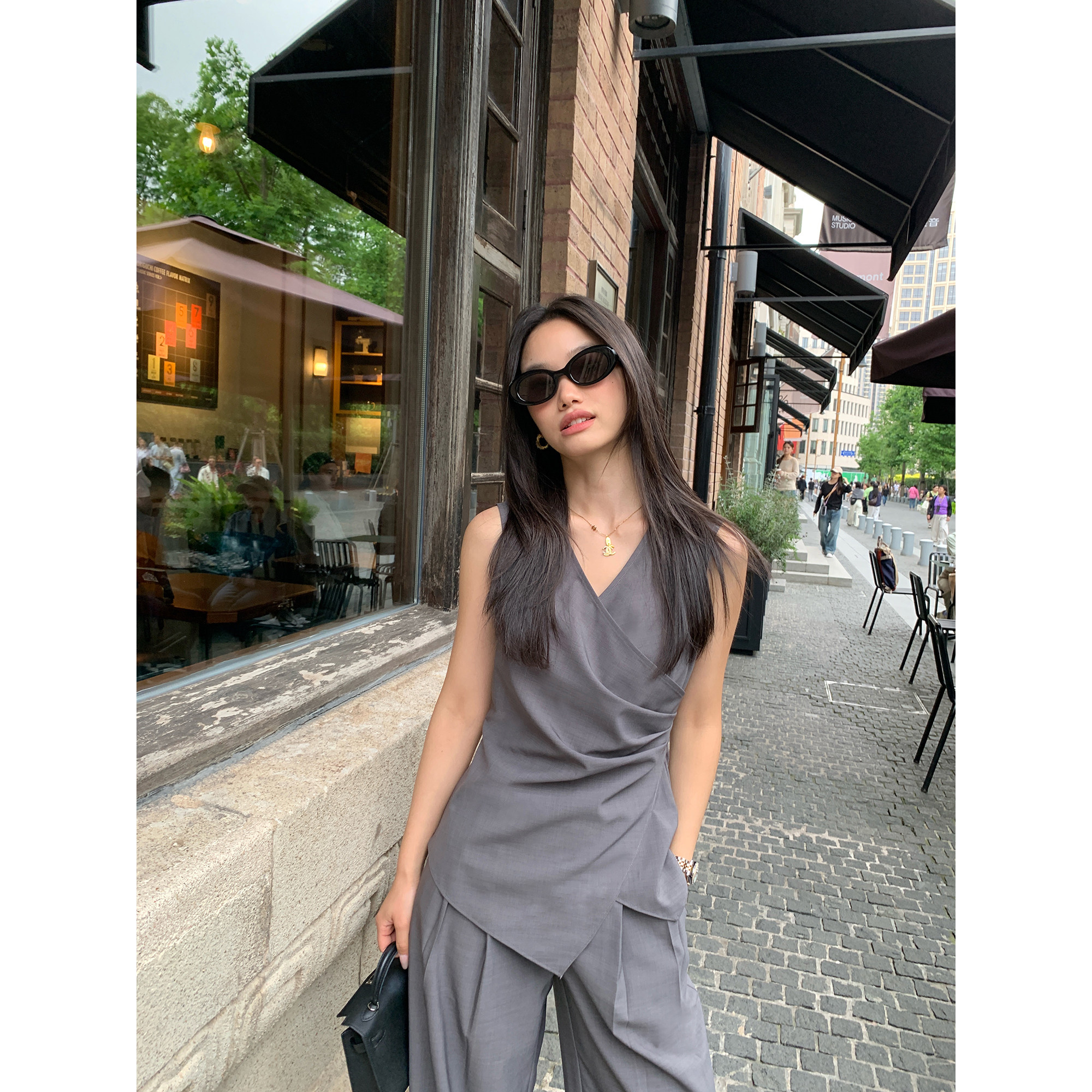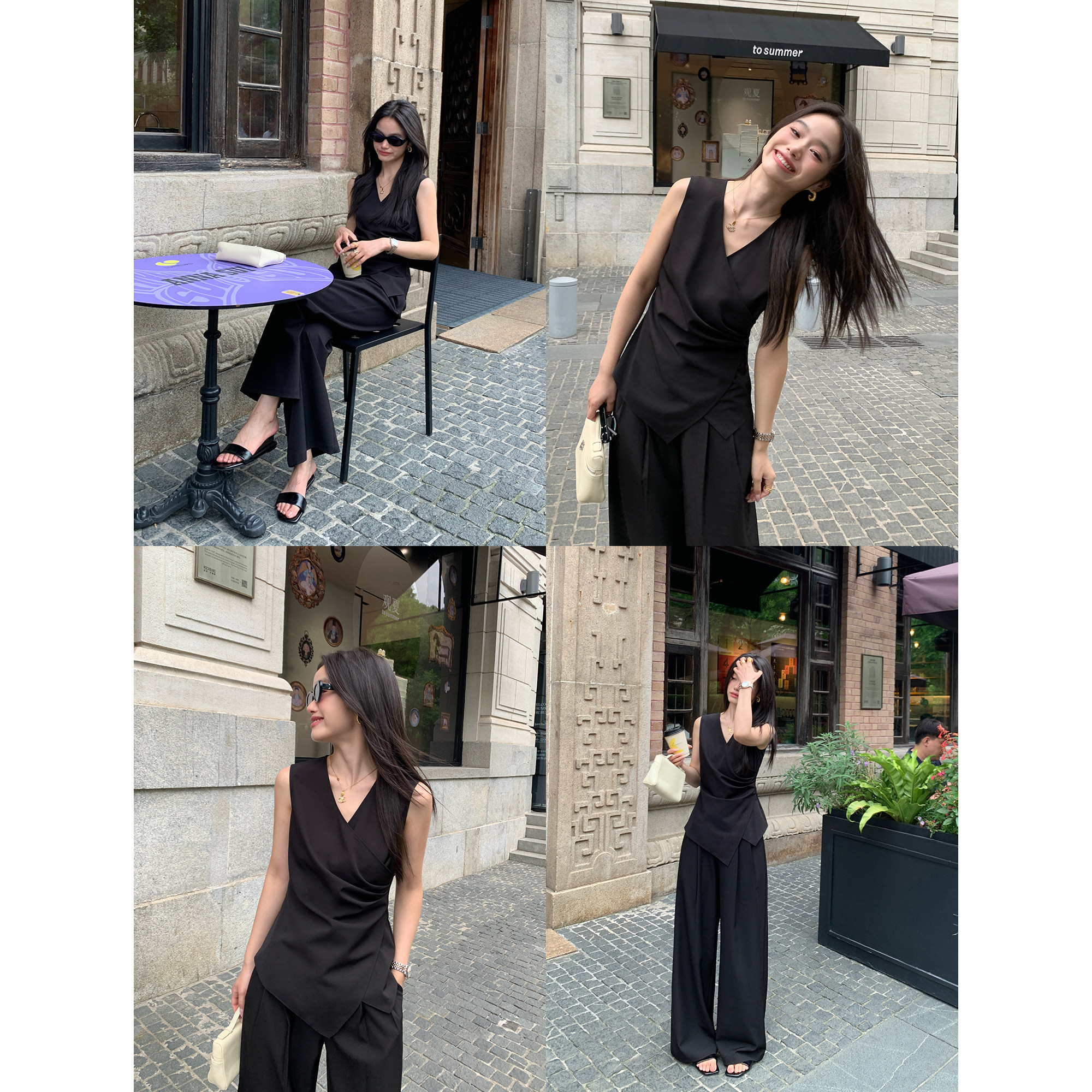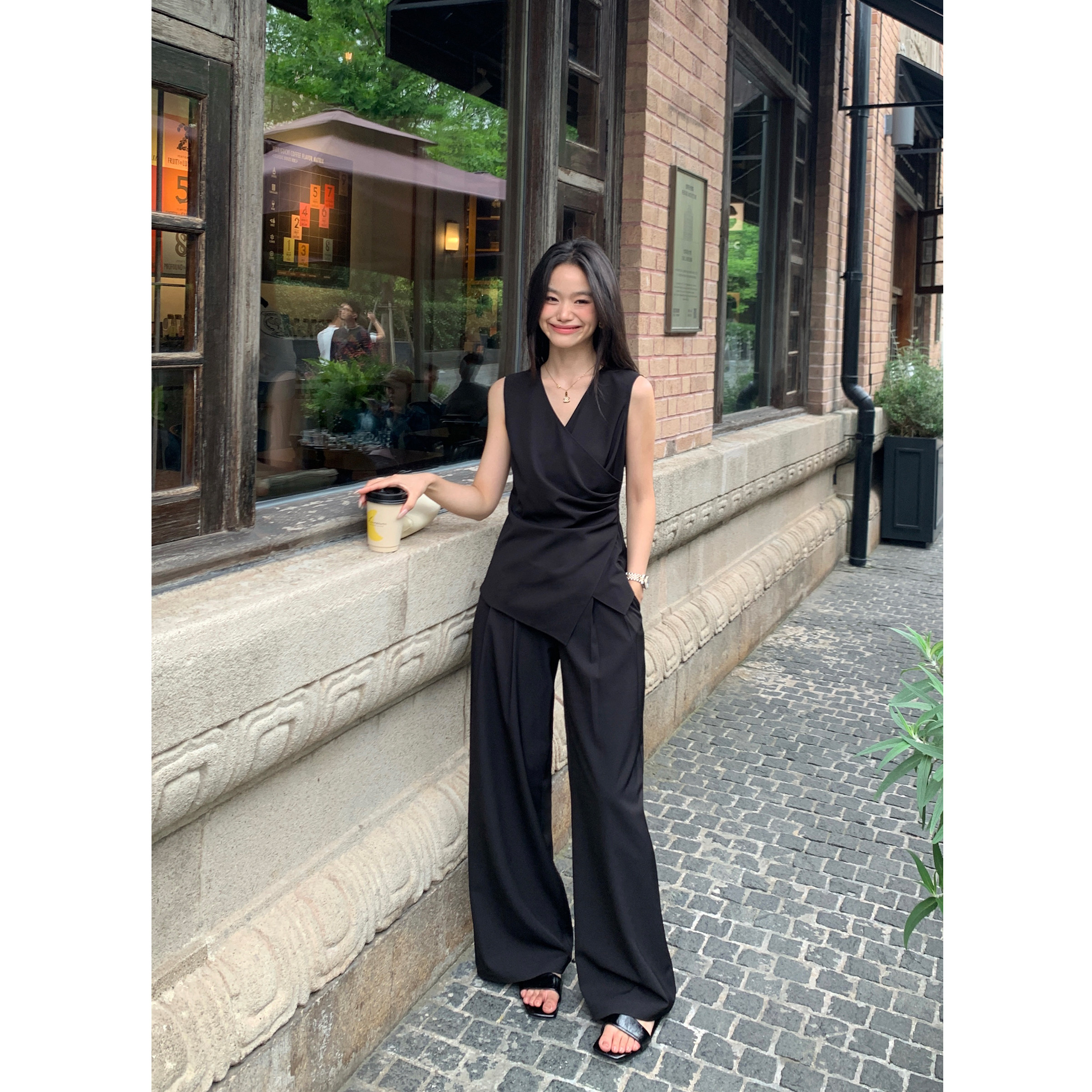 pusumede高智穿搭|v领交叉无袖背心上衣女+阔腿休闲裤老钱风套装