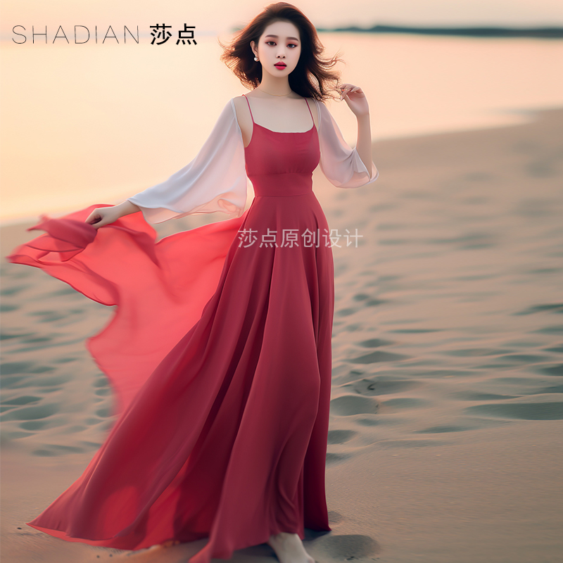 度假长裙红色连衣裙雪纺吊带裙洋气减龄夏季新款套装裙海边沙滩裙