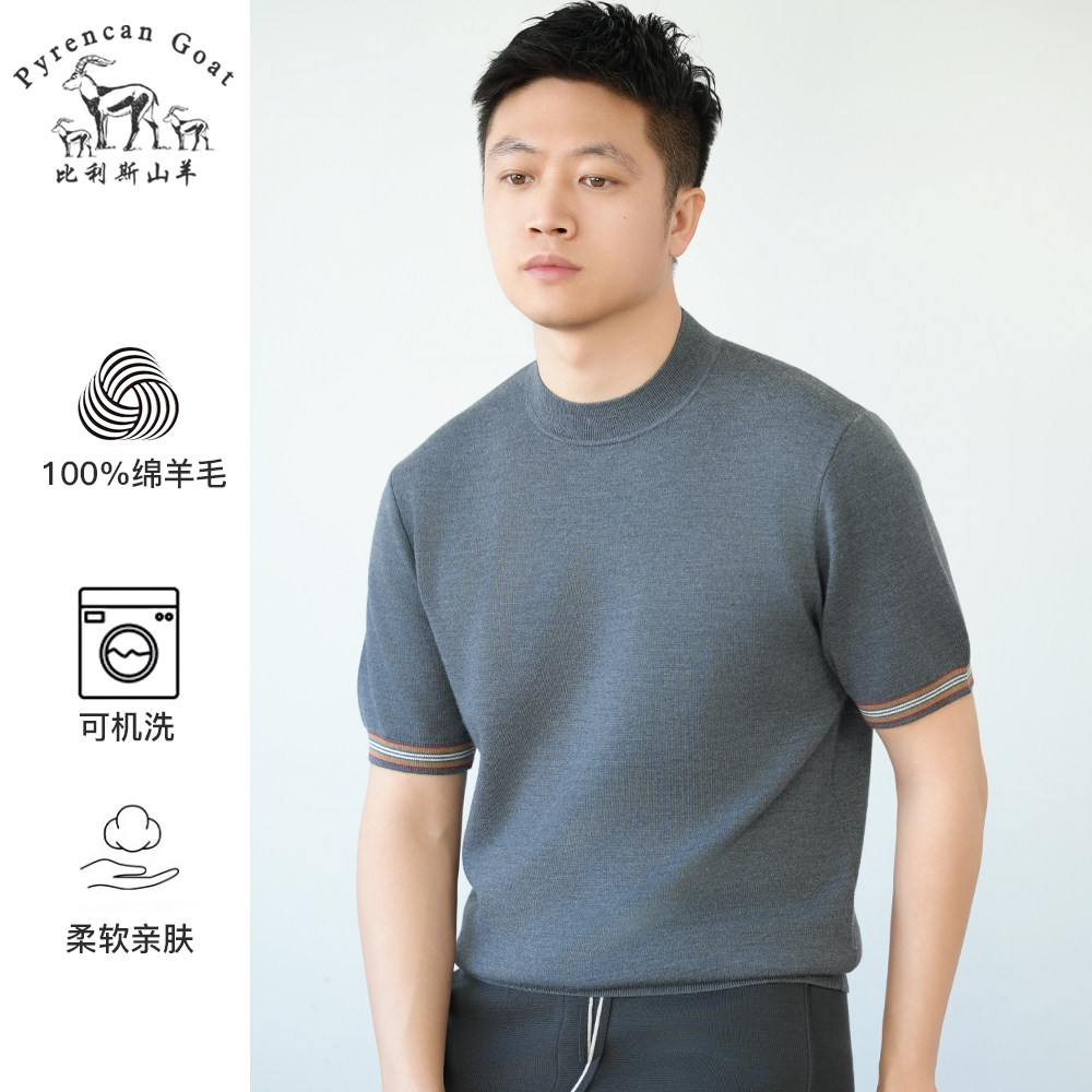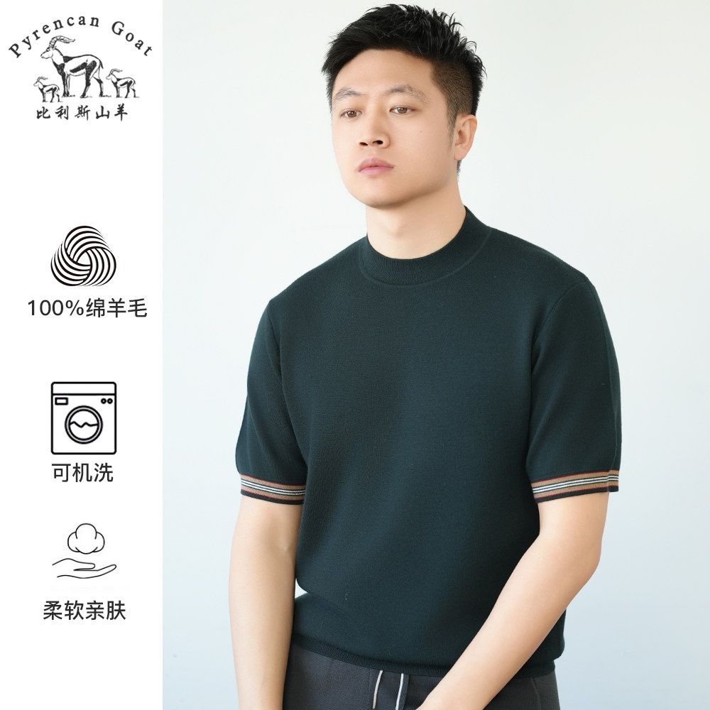 春季新款纯羊毛双面织可机洗羊毛衫男士纯色针织圆领厚款短袖T恤