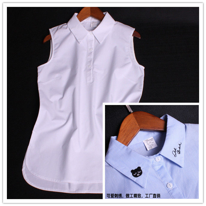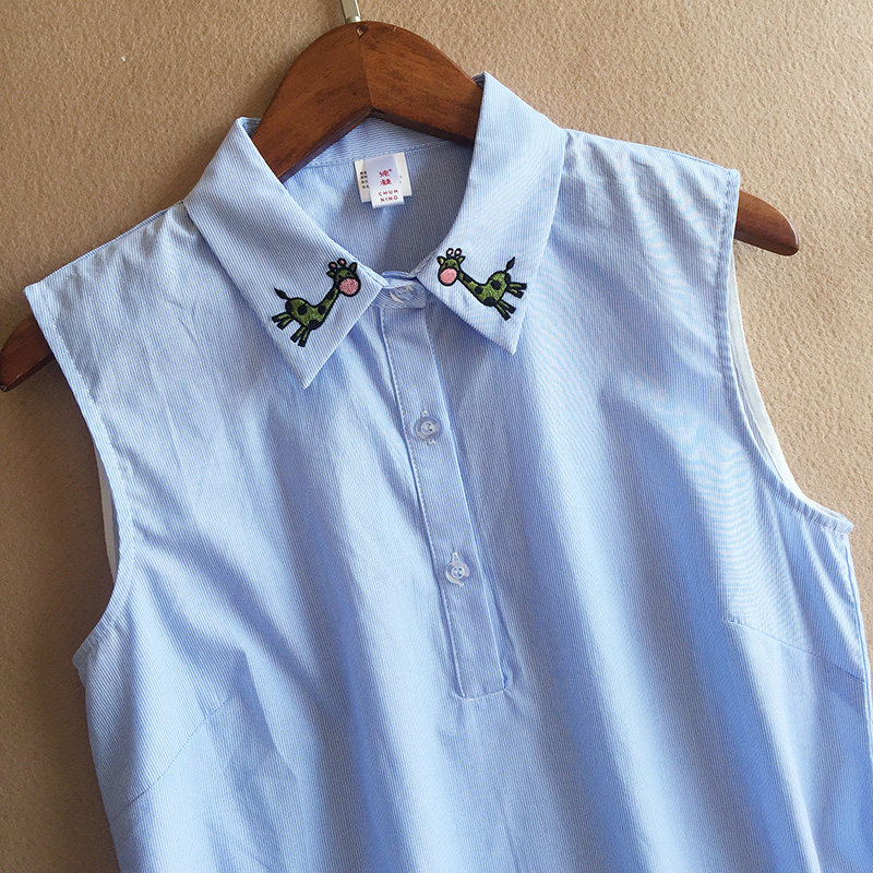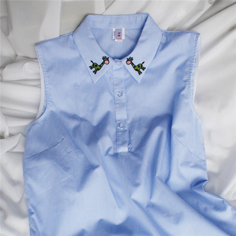 包邮蓝白细条纹衬衫女式夏新款纯棉刺绣花衬衣宽松百搭打底衫上衣