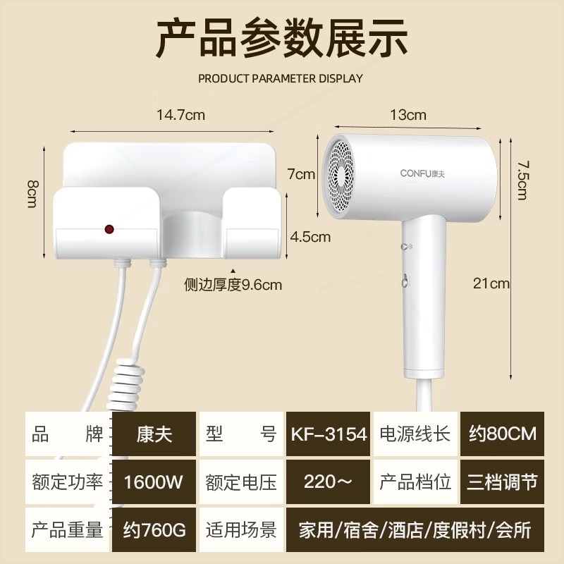 康夫电吹风1600W酒店宾馆浴室专家用恒温护发吹风机用壁挂式风筒