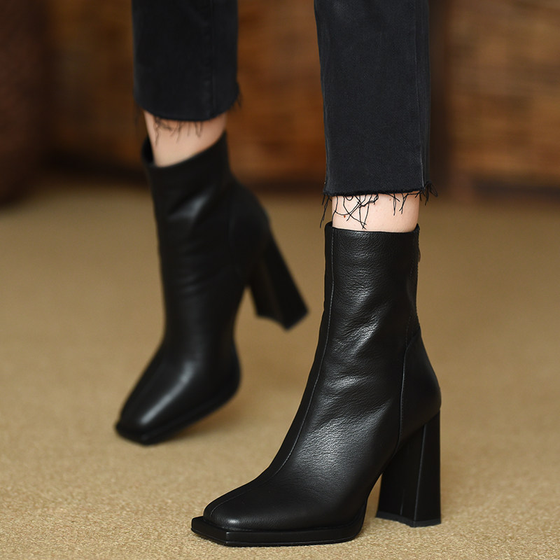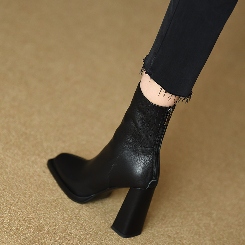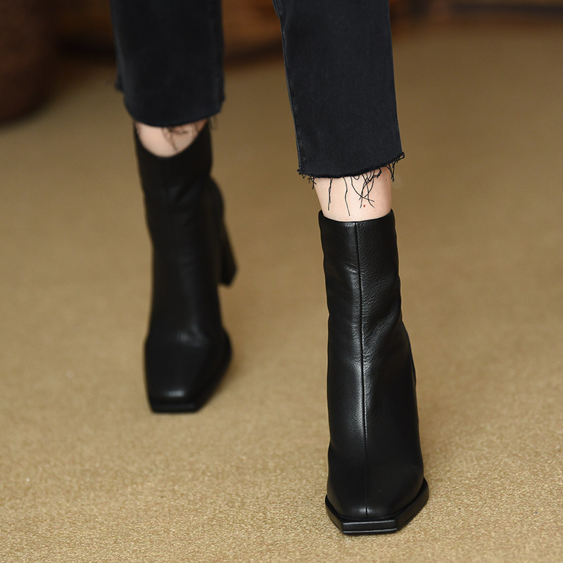 misili 9.8cm方头平底粗跟短靴女2024秋冬季新款高跟鞋黑色女靴子