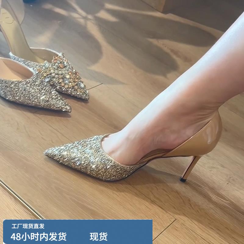 2024新款尖头浅口亮片中空漆皮裸色单鞋女秋季性感气质细跟高跟鞋