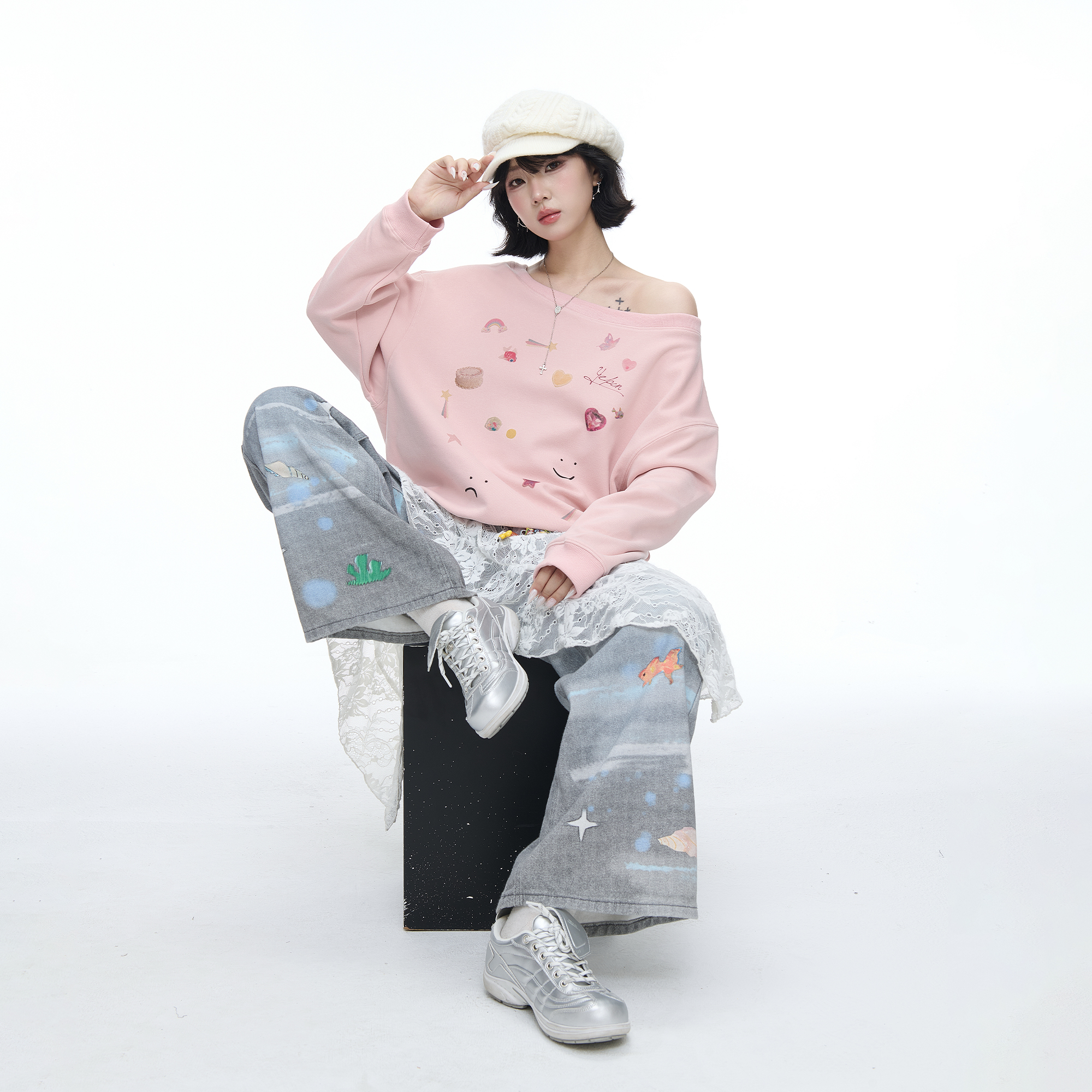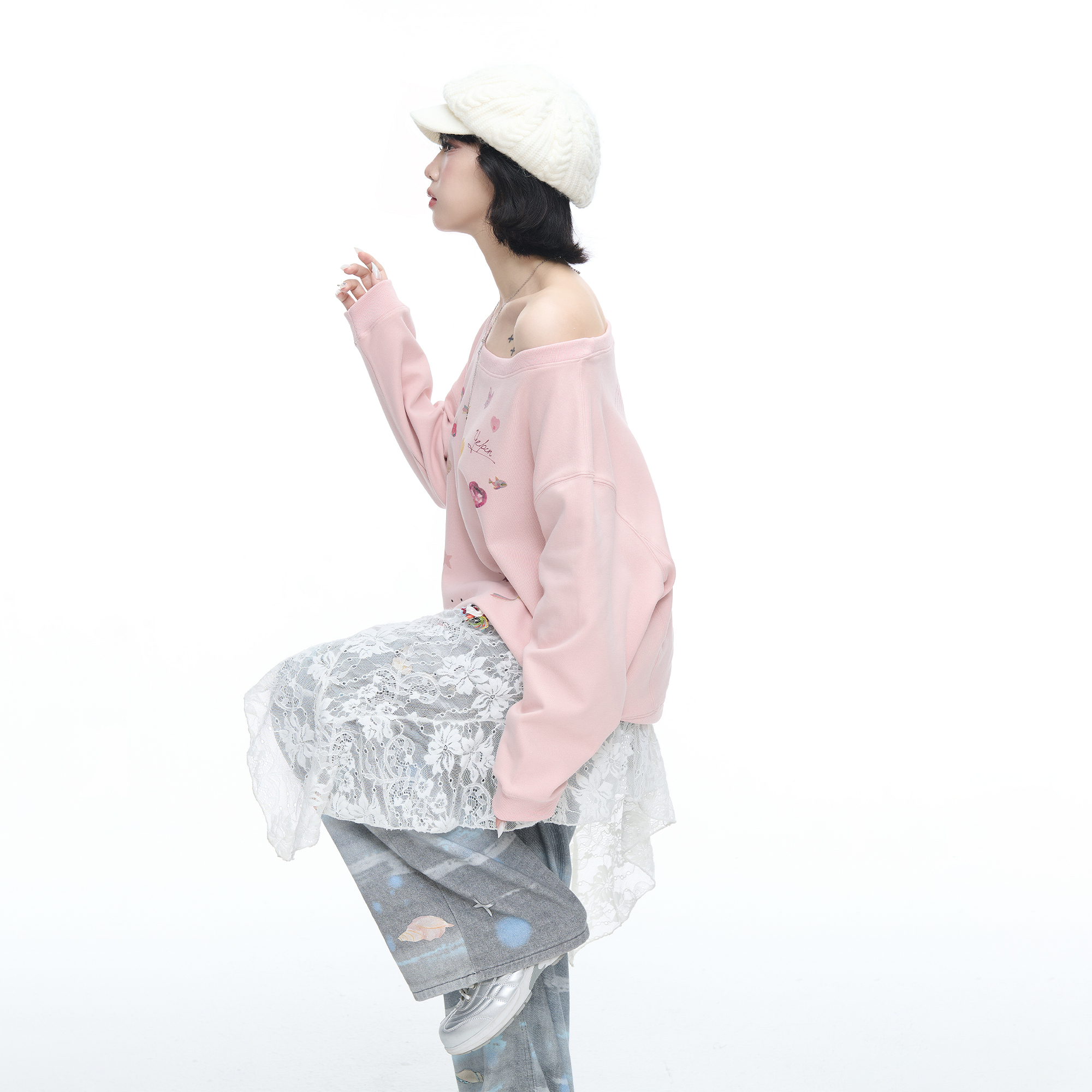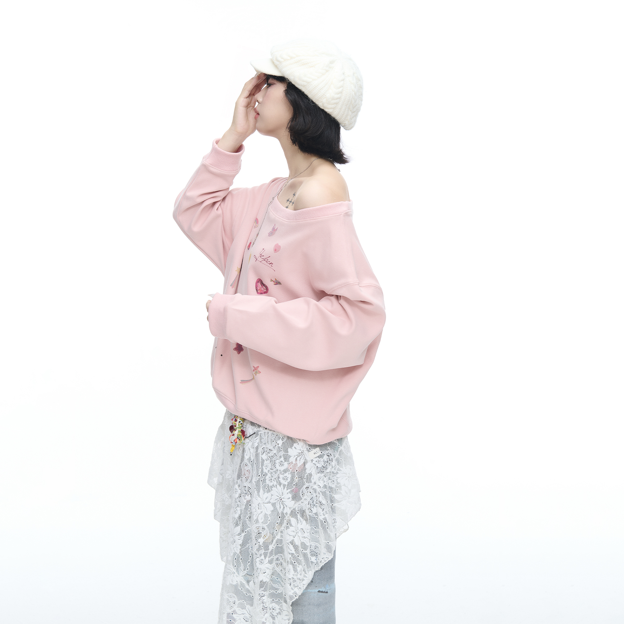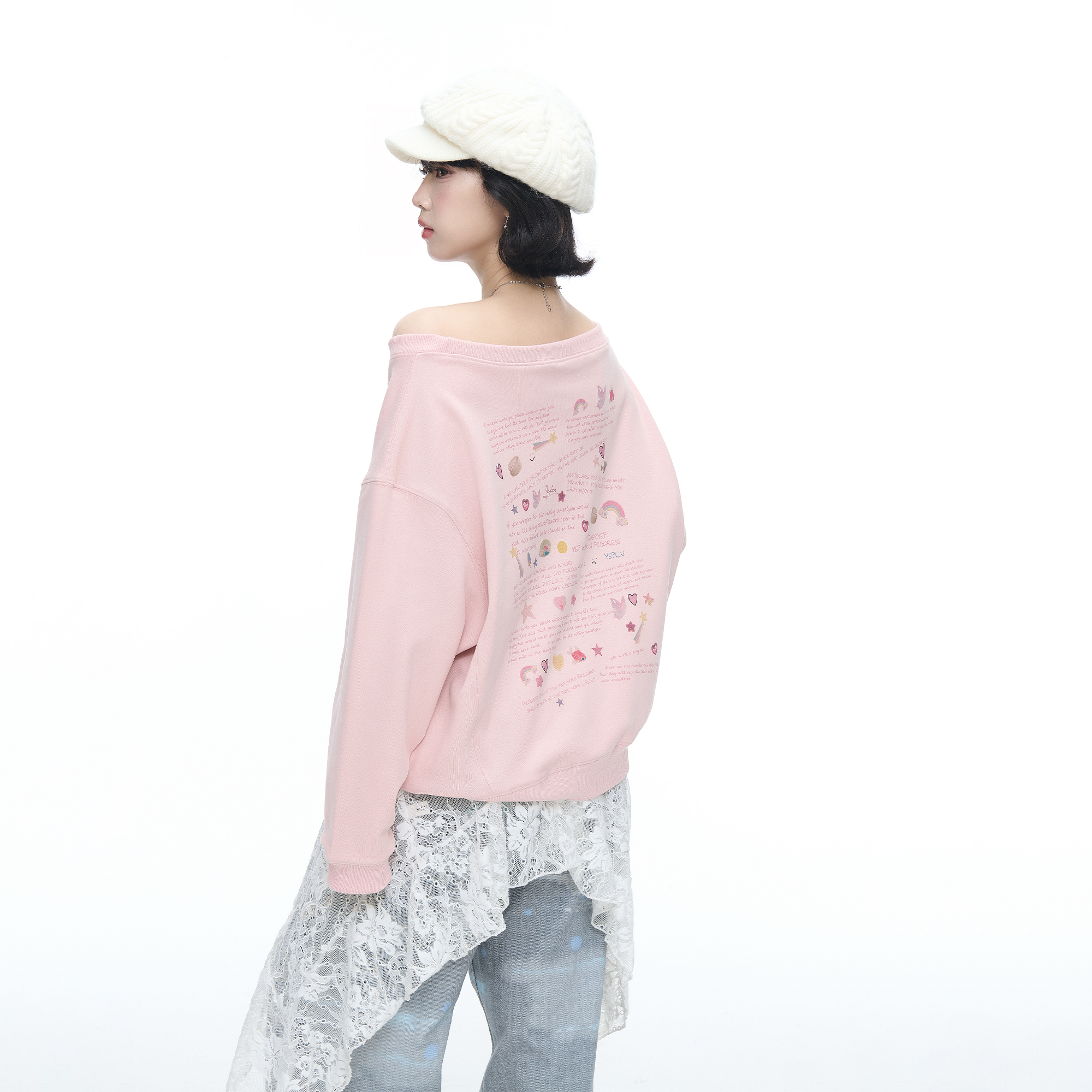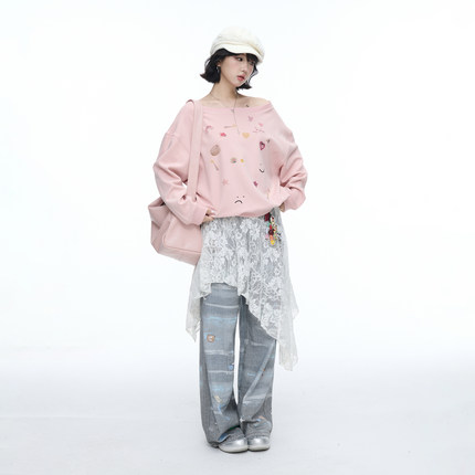 美式复古涂鸦印花斜肩长袖卫衣女早秋新款宽松chic慵懒风露肩上衣