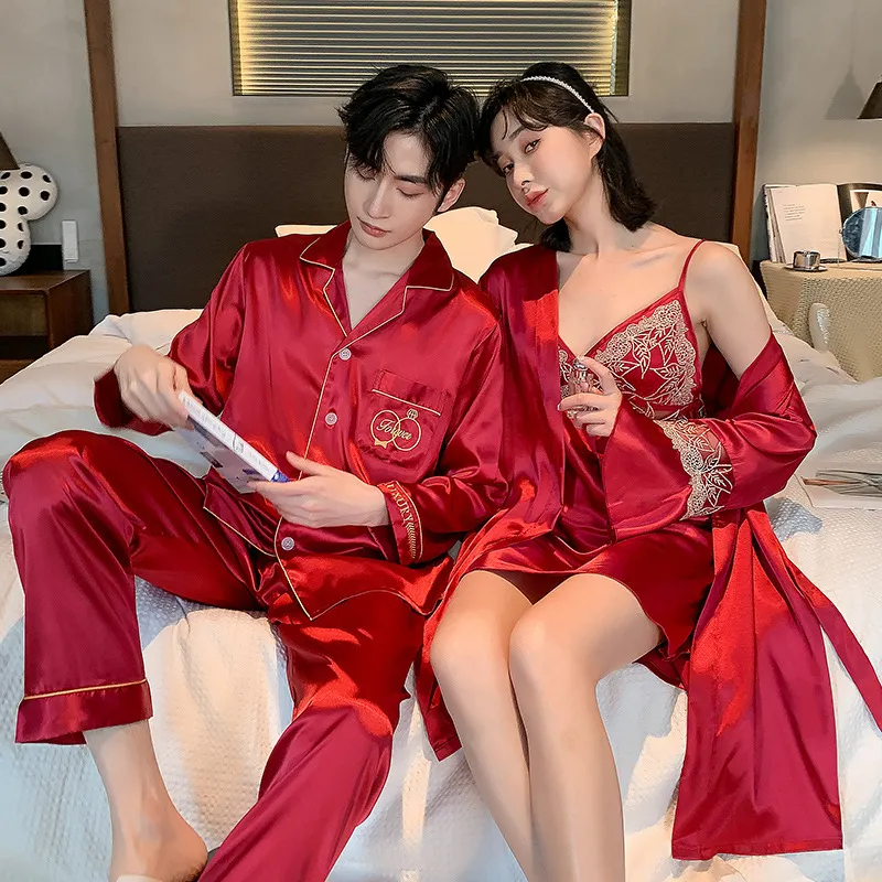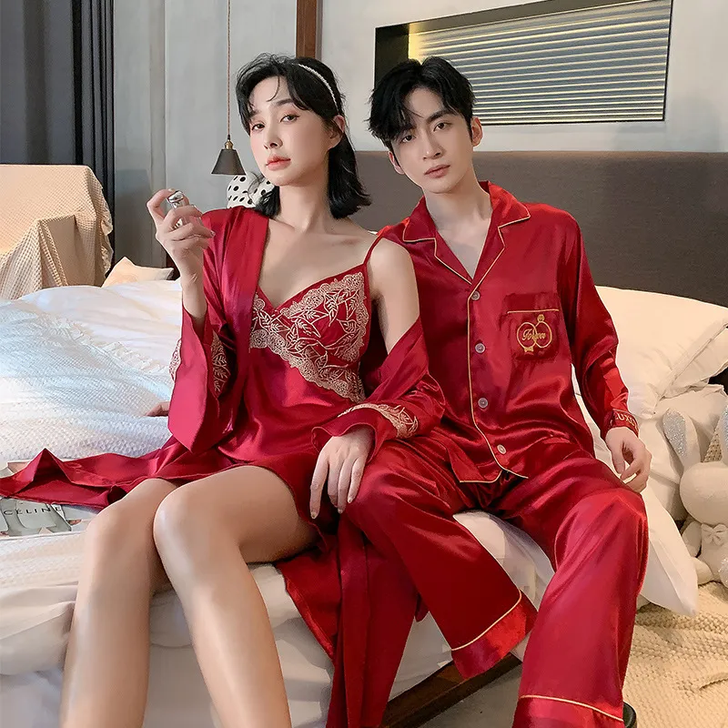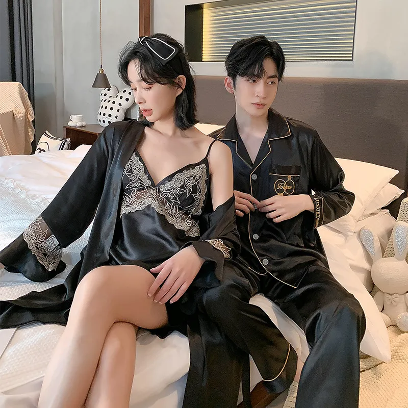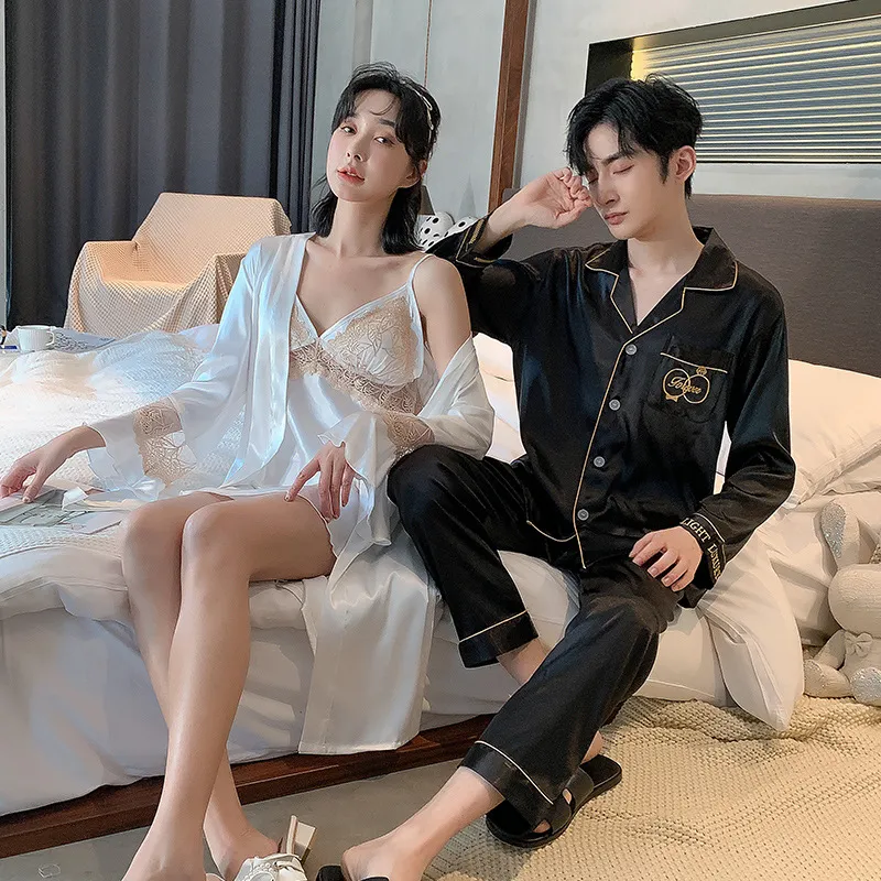 春夏新款丝绸情侣睡衣男士长袖套装冰丝女士镂空浴袍吊裙两件套