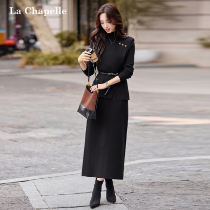 拉夏贝尔法式气质女神范高端套装黑色针织马甲内搭半裙三件套女秋
