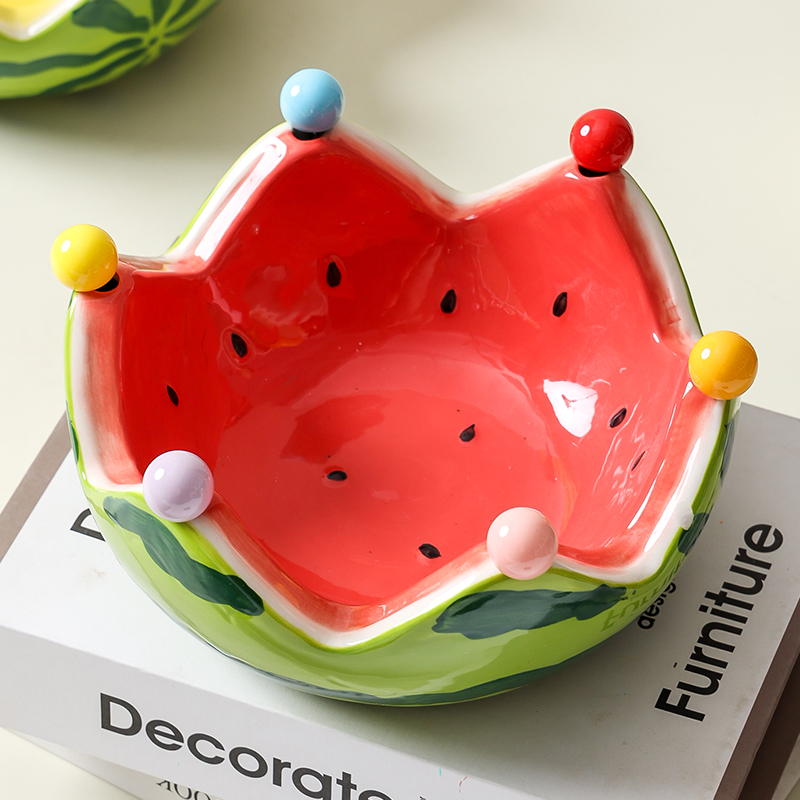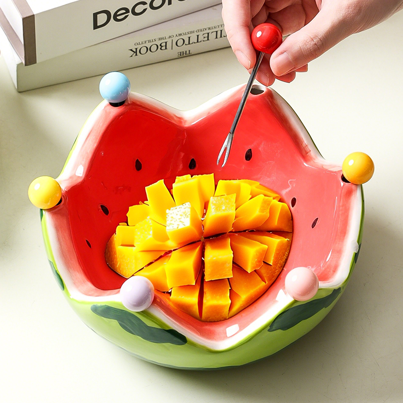 创意陶瓷西瓜水果碗带叉家用客厅高颜值水果盘沙拉碗可爱不锈钢叉