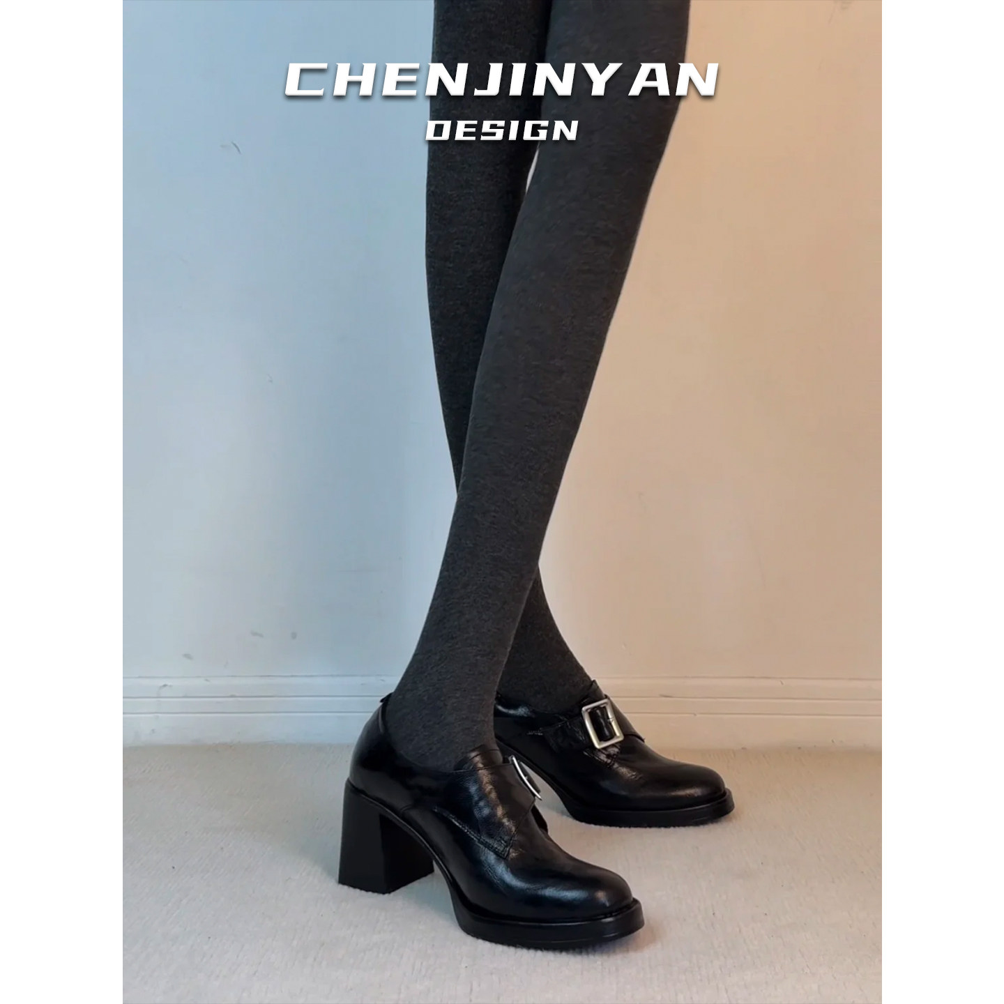 小羊皮!英伦圆头皮带扣粗跟乐福鞋女百搭通勤高跟单鞋厚底小皮鞋
