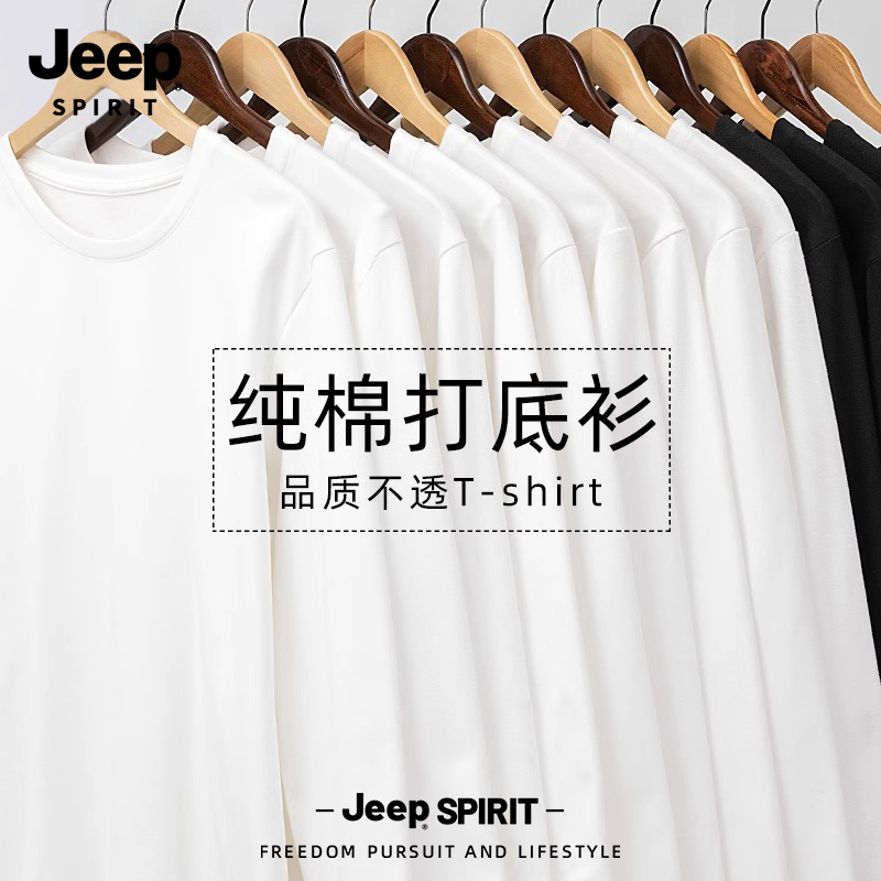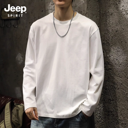 Jeep吉普纯棉白色长袖t恤男打底衫春秋季内搭上衣服男装圆领卫衣