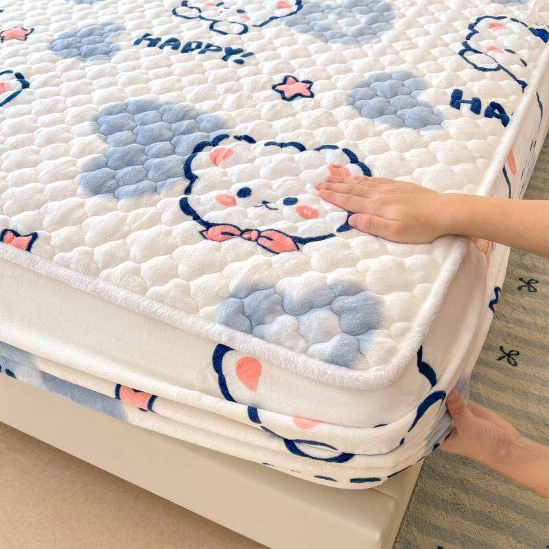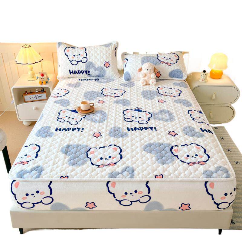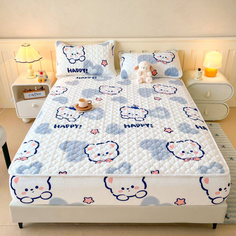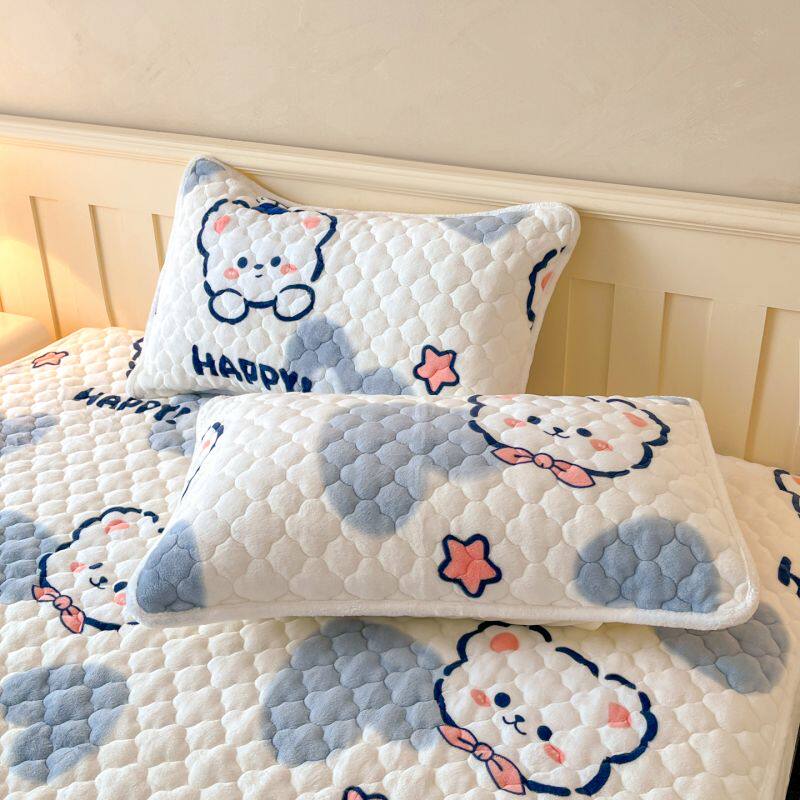高克重牛奶绒夹棉床笠加厚学生宿舍三件套卡通可爱床垫保护罩防尘