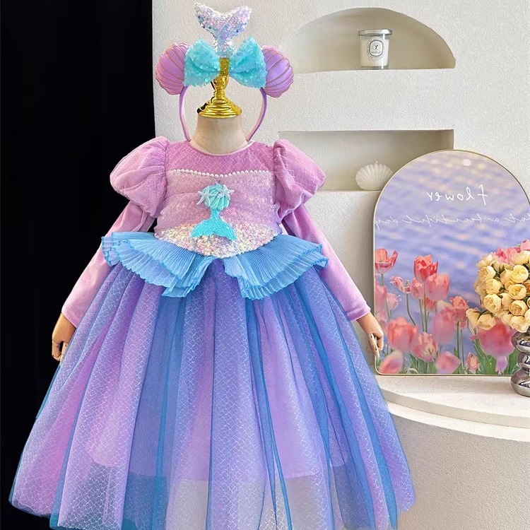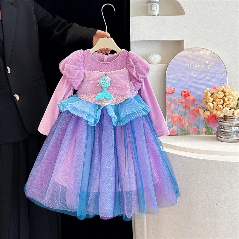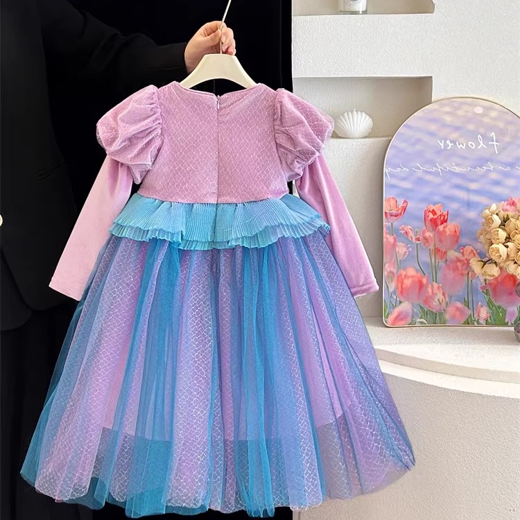 网红美人鱼公主裙女童长袖丝绒连衣裙小女孩生日万圣节儿童礼服裙