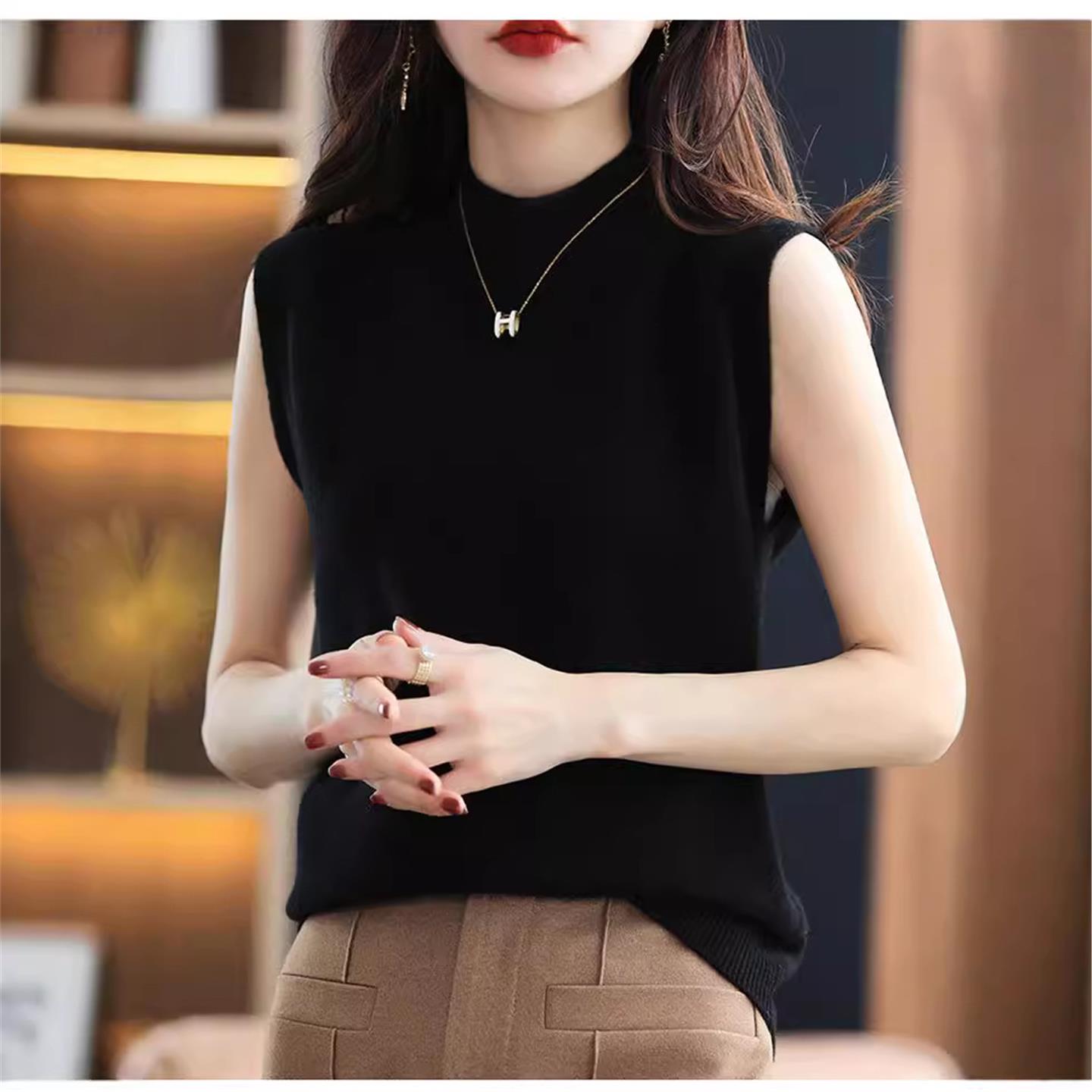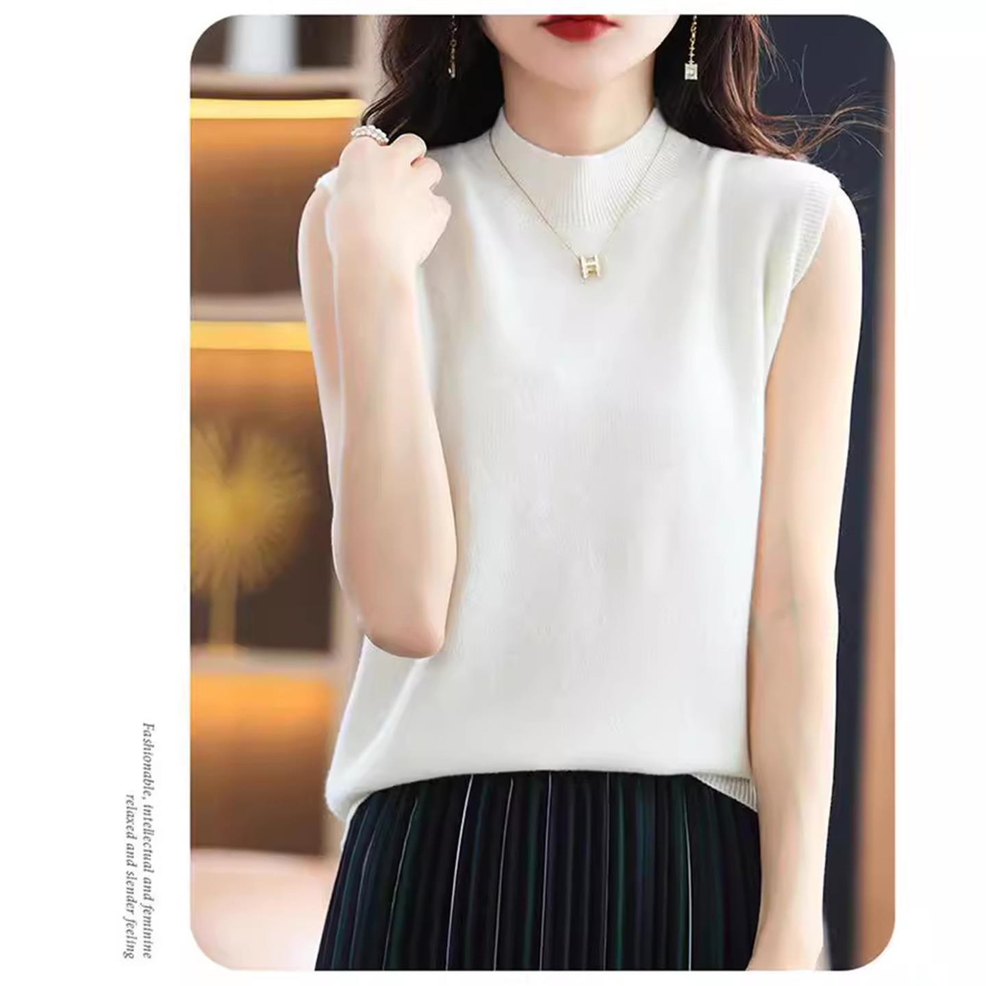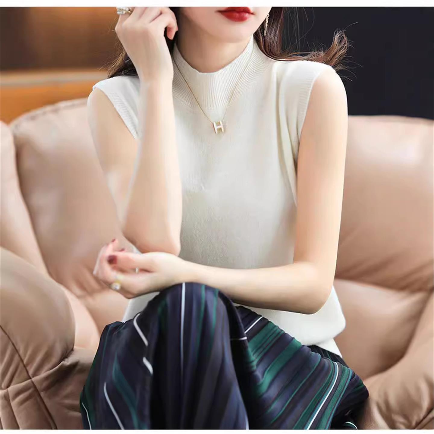 女士无袖半高领薄款背心内搭毛衣套头修身宽松针织打底衫外穿上衣
