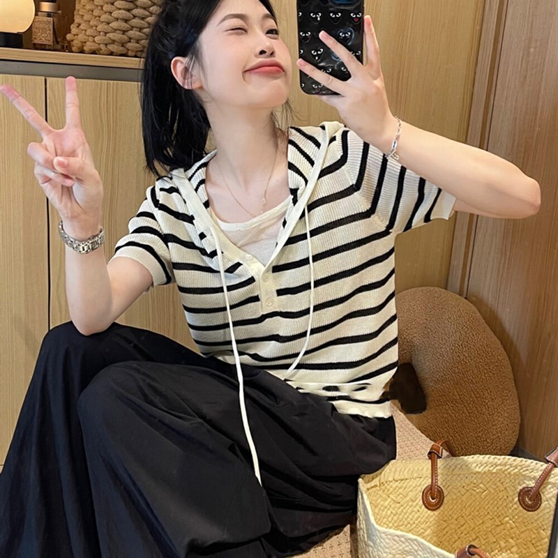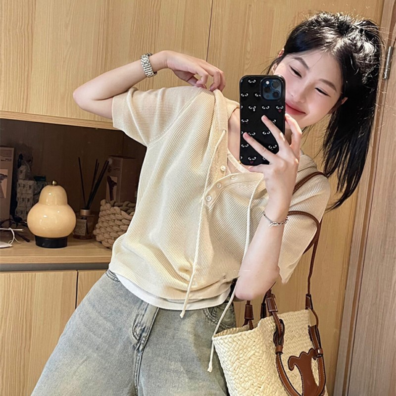 日系薄款假两件连帽短袖针织衫女夏季慵懒松弛感卫衣冰丝T恤上衣